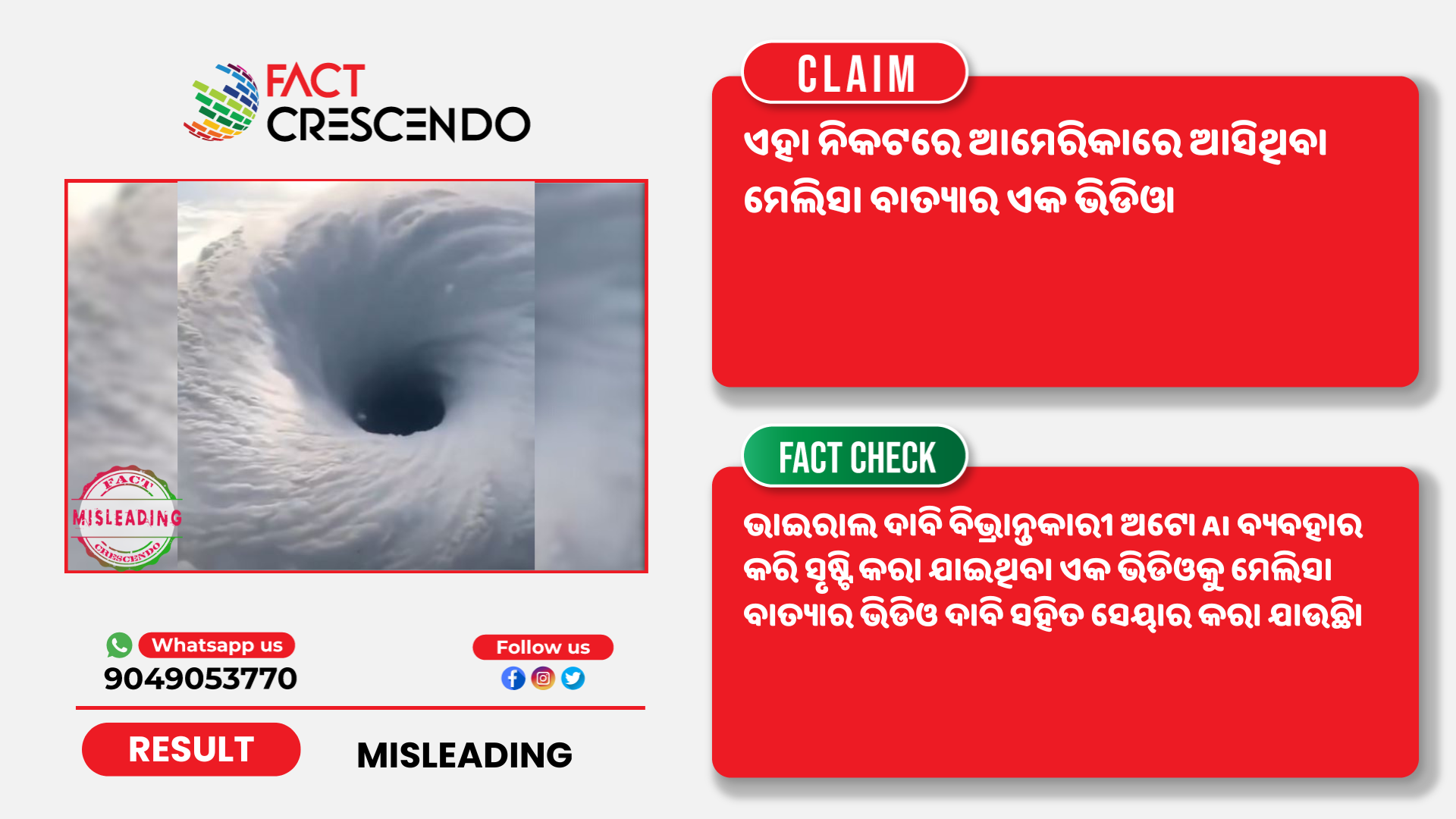ଆମ ଅନୁସନ୍ଧାନରୁ ପ୍ରମାଣିତ ହେଲା ଯେ ଭାଇରାଲ ଦାବି ବିଭ୍ରାନ୍ତକାରୀ ଅଟେ। AI ବ୍ୟବହାର କରି ସୃଷ୍ଟି କରା ଯାଇଥିବା ଏକ ଭିଡିଓକୁ ମେଲିସା ବାତ୍ୟାର ଭିଡିଓ ଦାବି ସହିତ ସେୟାର କରା ଯାଉଛି।