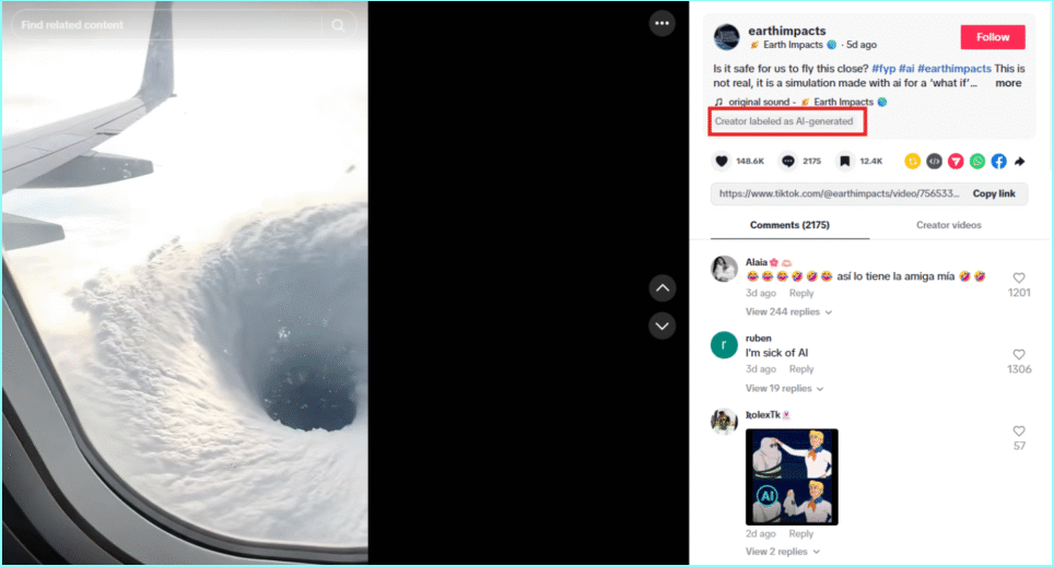 ଆମ ଅନୁସନ୍ଧାନରେ ପ୍ରଥମେ ଆମେ ଭାଇରାଲ ଭିଡିଓକୁ ବିଭିନ୍ନ ଫ୍ରେମରେ ବିଭାଜିତ କରି ପ୍ରତ୍ଯେକ ଫ୍ରେମର ଗୁଗୁଲ ରିଭର୍ସ ଇମେଜ୍ ସର୍ଚ୍ଚ କରିଲୁ। ଆମେ ଜାଣିବାକୁ ପାଇଲୁ ଯେ ଭିଡିଓଟି ୯ ଦିନ ପୂର୍ବରୁ (୨୬.୧୦.୨୦୨୫) TikTok ର @earthimpacts ଏକାଉଣ୍ଟରେ ଅପଲୋଡ୍ କରାଯାଇଥିଲା।