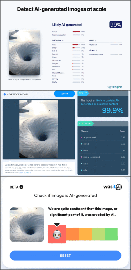 ଯଦି ଆମେ ଉପରୋକ୍ତ ଭିଡିଓକୁ ଭଲଭାବେ ଦେଖିବା, ତେବେ ଆମେ ଦେଖିପାରିବା ଯେ ଫୁଟେଜରେ ଏକ ବିମାନ ଝଡ଼ର ଆଖି ଉପରେ ଉଡ଼ୁଥିବାର ଦେଖାଯାଉଛି, ଯାହା ମେଘର ଏକ ସମତୁଲ, ଗଭୀର “ଫନେଲ୍” ମାଧ୍ୟମରେ ତଳକୁ ପ୍ରକ୍ଷେପିତ ହେଉଛି, ଯାହା ପ୍ରକୃତ ଝଡ଼ କିପରି ଦେଖାଯାଏ ତାହାର ବିପରୀତ।