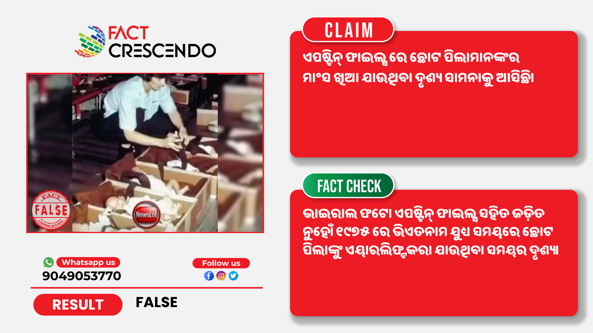 କିନ୍ତୁ ଫ୍ୟାକ୍ଟ କ୍ରିଷେଣ୍ଡୋ ଭାଇରାଲ ଦାବିକୁ ମିଥ୍ୟା ବୋଲି ଜାଣିବାକୁ ପାଇଲା। ୧୯୭୫ ଭିଏତନାମ ଯୁଧ୍ୟ ସମୟରେ ନବଜାତ ଶିଶୁ ମାନଙ୍କୁ ଏୟାରଲିଫ୍ଟ କରା ଯାଉଥିବା ଘଟଣାକୁ ଏପଷ୍ଟିନ୍ ଫାଇଲ୍ସ ସହିତ ଯୋଡ଼ି ସେୟାର କରା ଯାଉଛି।
