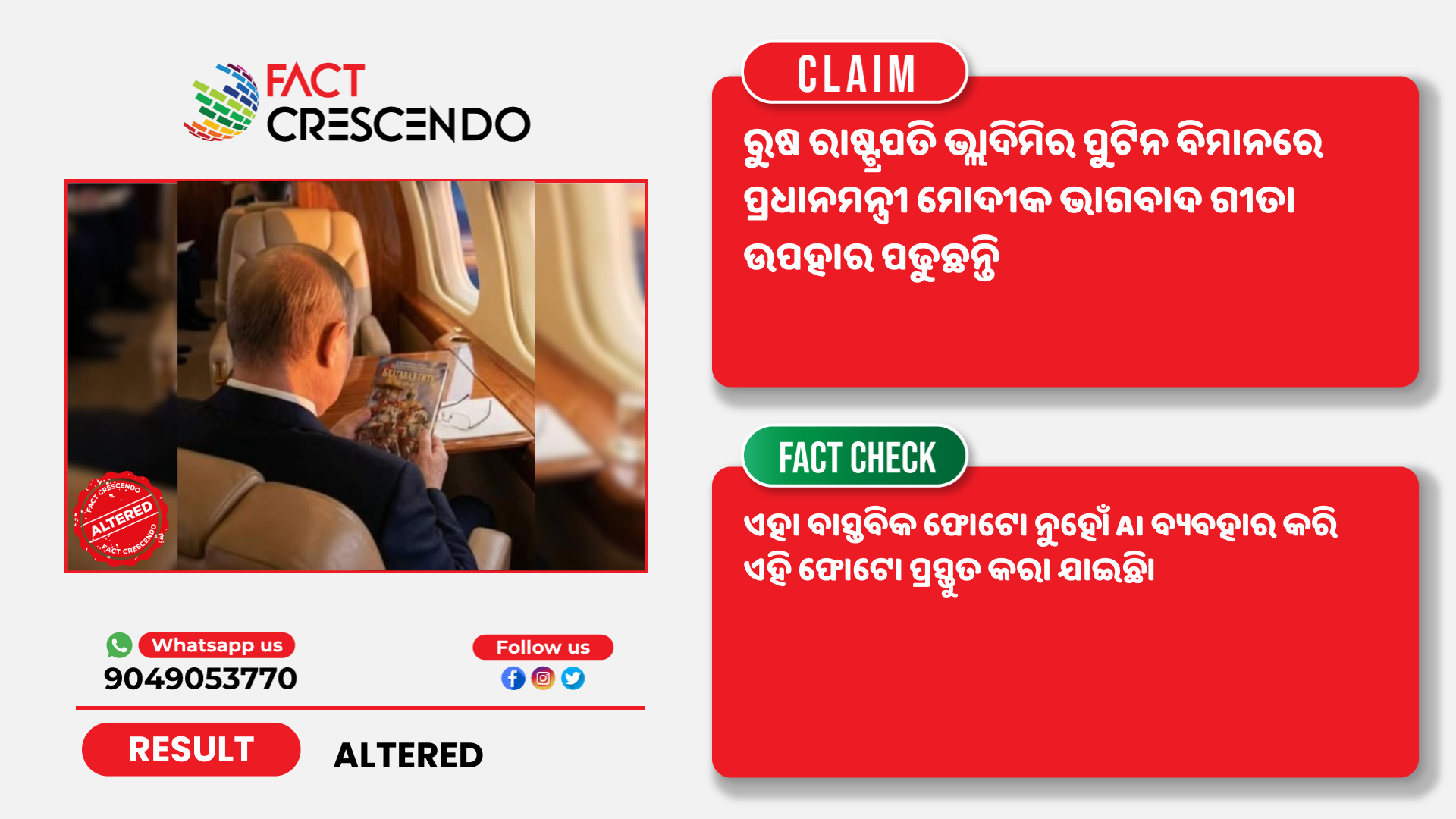 ଦୁଇ ଦିନିଆ ଗସ୍ତରେ ଭାରତ ଆସିଥିବା ରୁଷ ରାଷ୍ଟ୍ରପତି ଭ୍ଲାଦିମିର ପୁଟିନଙ୍କୁ ପ୍ରଧାନମନ୍ତ୍ରୀ ନରେନ୍ଦ୍ର ମୋଦି ଭଗବଦ୍ ଗୀତାର ରୁଷୀୟ ଅନୁବାଦର ଏକ କପି ଉପହାର ଦେଇଛନ୍ତି। ଏହି ପ୍ରସଙ୍ଗରେ, ସୋସିଆଲ ମିଡିଆରେ ଏକ ଫୋଟୋ ଭାଇରାଲ ହେଉଛି ଯେଉଁଥିରେ ରୁଷ ରାଷ୍ଟ୍ରପତି ଭ୍ଲାଦିମିର ପୁଟିନ ବିମାନରେ ଭଗବଦ୍ ଗୀତା ସହିତ ବସିଥିବା ଦେଖା ଯାଇ ପାରିବ।