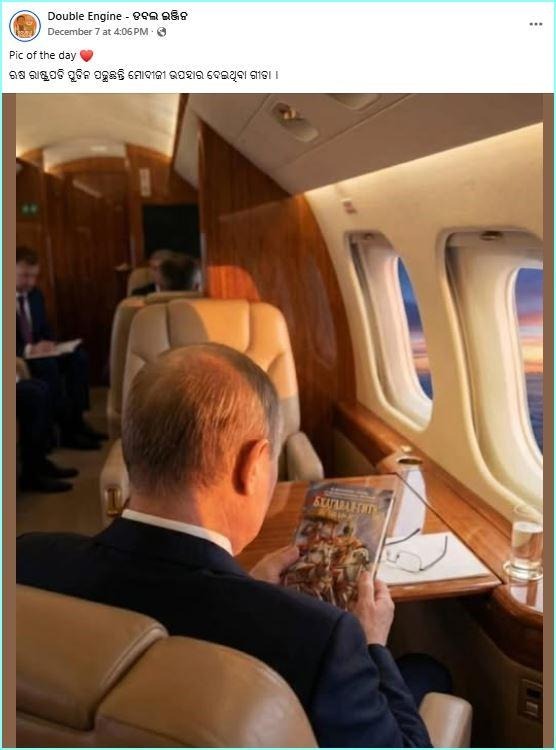 Title:ବିମାନରେ ଭଗବଦ୍ ଗୀତା ସହିତ ଭ୍ଲାଦିମିର ପୁଟିନଙ୍କ ଚିତ୍ର AI ଦ୍ୱାରା ପ୍ରସ୍ତୁତ କରା ଯାଇଛି।