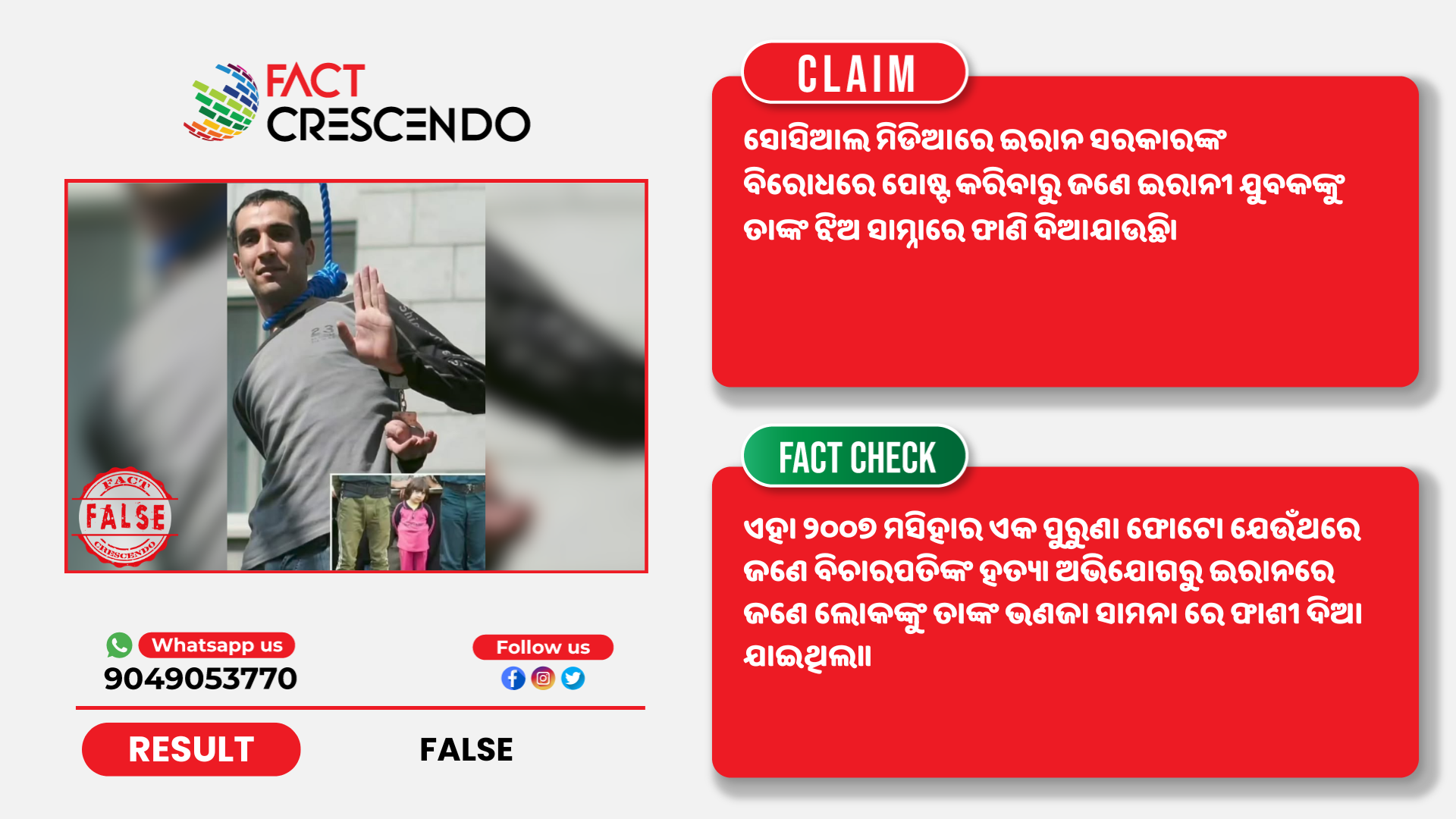କିନ୍ତୁ ଫ୍ୟାକ୍ଟ କ୍ରିଷେଣ୍ଡୋ ଭାଇରାଲ ଦାବିକୁ ମିଥ୍ୟା ବୋଲି ଜାଣିବାକୁ ପାଇଲା। ଏହା ୨୦୦୭ ମସିହାର ଏକ ପୁରୁଣା ଫୋଟୋ ଯେଉଁଥିରେ ଜଣେ ବିଚାରପତିଙ୍କ ହତ୍ୟା ଅଭିଯୋଗରୁ ଇରାନରେ ଜଣେ ଲୋକଙ୍କୁ ତାଙ୍କ ଭଣଜା ସାମନା ରେ ଫାଶୀ ଦିଆ ଯାଇଥିଲା।