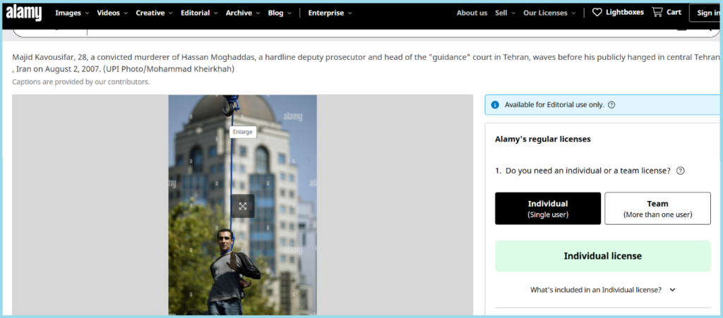 ଆମ ଅନୁସନ୍ଧାନରେ ପ୍ରଥମେ ଆମେ ଭାଇରାଲ ଫୋଟୋର ଗୁଗୁଲ ରିଭର୍ସ ଇମେଜ୍ ସର୍ଚ୍ଚ କରିଲୁ। ଫଳସ୍ଵରୂପ ଆମକୁ ଆଲମୀ ୱେବସାଇଟରେ ସମାନ ଫୋଟୋ ପ୍ରକାଶିତ ହେଇଥିବା ମିଳିଲା। କ୍ୟାପସନରେ ଲେଖାଯାଇଛି, “୨୮ ବର୍ଷୀୟ ମାଜିଦ କାଭୋସିଫର, ଡେପୁଟି ପବ୍ଲିକ ପ୍ରସିକ୍ୟୁଟର ଏବଂ ତେହେରାନର “ପଥଦର୍ଶନ” କୋର୍ଟର ମୁଖ୍ୟ ହାସନ ମୋଗାଦ୍ଦାସଙ୍କ ହତ୍ୟା ଅଭିଯୋଗରେ ଅଗଷ୍ଟ ୨, ୨୦୦୭ ରେ ଇରାନର କେନ୍ଦ୍ରୀୟ ତେହେରାନରେ ସର୍ବସାଧାରଣରେ ଫାଶୀ ଦେବା ପୂର୍ବରୁ ହାତ ହଲାଇଛନ୍ତି।”