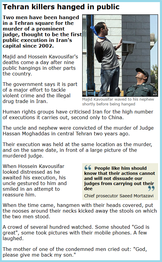 ୨ ଅଗଷ୍ଟ ୨୦୦୭ ରେ ବିବିସିରେ ପ୍ରକାଶିତ ଏକ ରିପୋର୍ଟରେ ଲେଖାଯାଇଥିଲା, “… ହତ୍ୟା ହୋଇଥିବା ସ୍ଥାନରେ ଏବଂ ସେହି ତାରିଖରେ, ହତ୍ୟା ହୋଇଥିବା ବିଚାରପତିଙ୍କ ଏକ ବଡ଼ ଫଟୋ ସମ୍ମୁଖରେ ସେମାନଙ୍କୁ ଫାଶୀ ଦିଆଯାଇଥିଲା।” ଯେତେବେଳେ ହୋସେନ୍ କାଭୋସିଫାର୍ ତାଙ୍କ ମୃତ୍ୟୁଦଣ୍ଡକୁ ଅପେକ୍ଷା କରି ଦୁଃଖିତ ଦେଖାଯାଉଥିଲେ, ତାଙ୍କ ମାମୁଁ ତାଙ୍କୁ ଇଙ୍ଗିତ କରି ଆଶ୍ୱସ୍ତ କରିବାକୁ ଚେଷ୍ଟା କରି ହସିଥିଲେ।