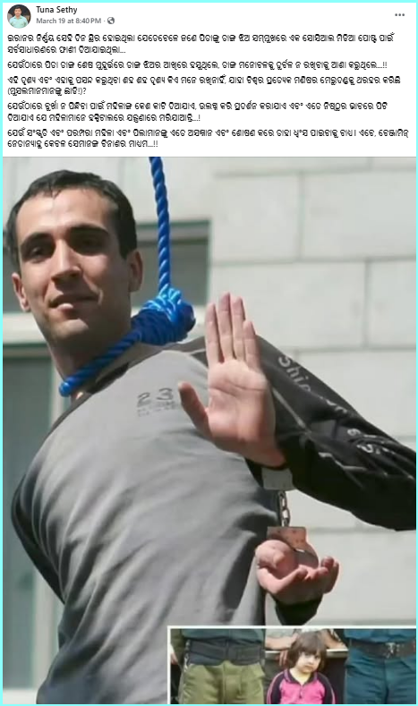 ନିକଟରେ ସୋସିଆଲ ମିଡିଆରେ ଏକ ଫଟୋ ଭାଇରାଲ ହୋଇଛି ଯେଉଁଥିରେ ଦାବି କରାଯାଇଛି ଯେ ଜଣେ ବ୍ୟକ୍ତି ସୋସିଆଲ ମିଡିଆରେ ଇରାନ ସରକାରଙ୍କ ବିରୋଧରେ ପୋଷ୍ଟ କରିଥିବାରୁ ନିଜ ଝିଅ ସାମନାରେ ତାଙ୍କୁ ଫାଶୀ ଦିଆ ଯାଇଛି। ଏହି ଫଟୋଟି ଦୁଇଟି ଫଟୋର ଏକ କୋଲାଜ୍, ଗୋଟିଏ ଫଟୋରେ ଜଣେ ବ୍ୟକ୍ତି ବେକରେ ଫାଶୀ ଲଗାଇ ହସୁଥିବା ଦେଖାଯାଉଛି ଏବଂ ଅନ୍ୟ ଫଟୋରେ ଗୋଟିଏ ଛୋଟ ଶିଶୁ ଠିଆ ହୋଇଥିବା ଦେଖାଯାଉଛି।