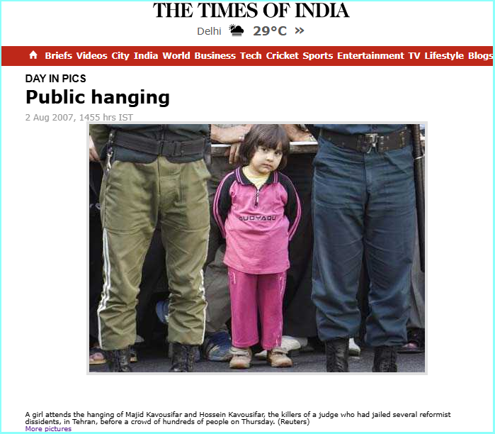 ଆମେ ୨ ଅଗଷ୍ଟ ୨୦୦୭ ରେ ଟାଇମ୍ସ ଅଫ୍ ଇଣ୍ଡିଆରେ ପ୍ରକାଶିତ ଏକ ରିପୋର୍ଟରେ ଭାଇରାଲ୍ ଫଟୋରେ ଥିବା ଛୋଟ ଝିଅଟିର ଫଟୋ ପାଇଲୁ। ଫଟୋର କ୍ୟାପସନରେ ଲେଖାଥିଲା, “ଗୁରୁବାର ଶହ ଶହ ଲୋକଙ୍କ ଭିଡ଼ ସମ୍ମୁଖରେ ତେହେରାନରେ ଅନେକ ସଂସ୍କାରବାଦୀ ବିରୋଧୀଙ୍କୁ ଜେଲରେ ବନ୍ଦୀ କରିଥିବା ଜଣେ ବିଚାରପତିଙ୍କ ହତ୍ୟାକାରୀ ମାଜିଦ କାଭୋସିଫର ଏବଂ ହୋସେନ କାଭୋସିଫରଙ୍କ ଫାଶୀରେ ଜଣେ ଝିଅ ଯୋଗ ଦେଇଛି।“