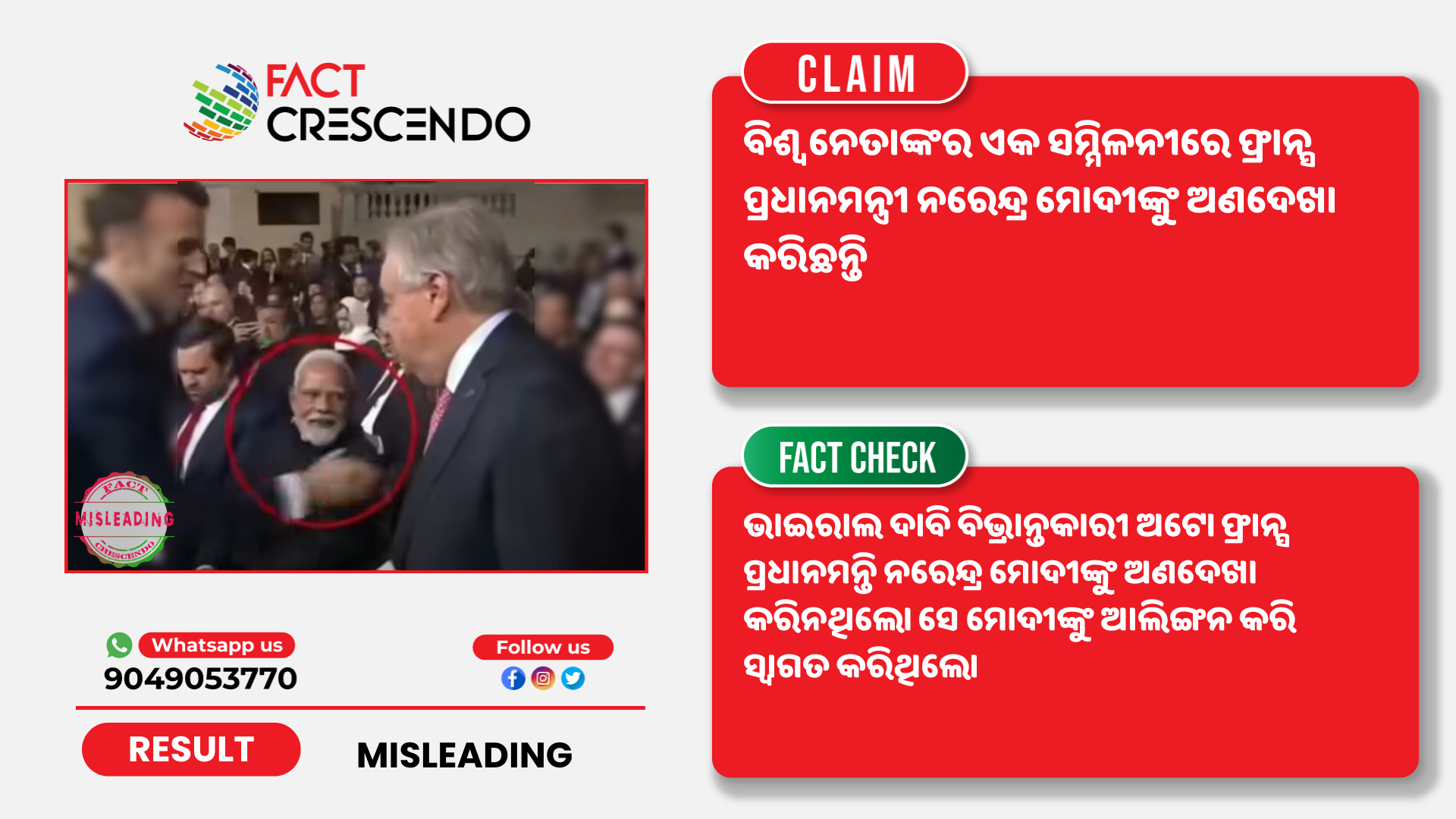 କିନ୍ତୁ ଫ୍ୟାକ୍ଟ କ୍ରିଷେଣ୍ଡୋ ଭାଇରାଲ ଦାବିକୁ ବିଭ୍ରାନ୍ତକାରୀ ବୋଲି ଜାଣିବାକୁ ପାଇଲା। ଫ୍ରାନ୍ସ ପ୍ରଧାନମନ୍ତି ନରେନ୍ଦ୍ର ମୋଦୀଙ୍କୁ ଅଣଦେଖା କରିନଥିଲେ। ସେ ମୋଦୀଙ୍କୁ ଆଲିଙ୍ଗନ କରି ସ୍ଵାଗତ କରିଥିଲେ।