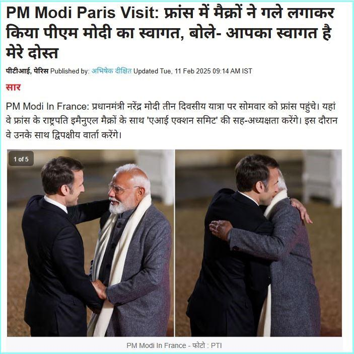 ଏହି ଅବସର ବିଷୟରେ, ଅମର ଉଜାଲାର ପ୍ରକାଶିତ ରିପୋର୍ଟକୁ ଦେଖିଲେ ଜଣାପଡ଼େ ଯେ ଫ୍ରାନ୍ସ ରାଷ୍ଟ୍ରପତି ଇମାନୁଏଲ ମାକ୍ରନ୍ ପ୍ୟାରିସରେ AI ଶିଖର ସମ୍ମିଳନୀରେ ସହ-ଅଧ୍ୟକ୍ଷତା କରିବା ପାଇଁ ପ୍ରଧାନମନ୍ତ୍ରୀ ମୋଦିଙ୍କୁ ଆଲିଙ୍ଗନ କରି ସ୍ୱାଗତ କରିଥିଲେ ଏବଂ ତାଙ୍କୁ ତାଙ୍କର ବନ୍ଧୁ ବୋଲି କହିଥିଲେ। ରିପୋର୍ଟରେ ଉଭୟ ନେତାଙ୍କ କିଛି ଫଟୋ ପୋଷ୍ଟ କରାଯାଇଛି, ଯେଉଁଥିରେ ଉଭୟ ପରସ୍ପରକୁ ଆଲିଙ୍ଗନ କରୁଥିବା ଏବଂ ଭେଟିଥିବା ଦେଖାଯାଇଛି।