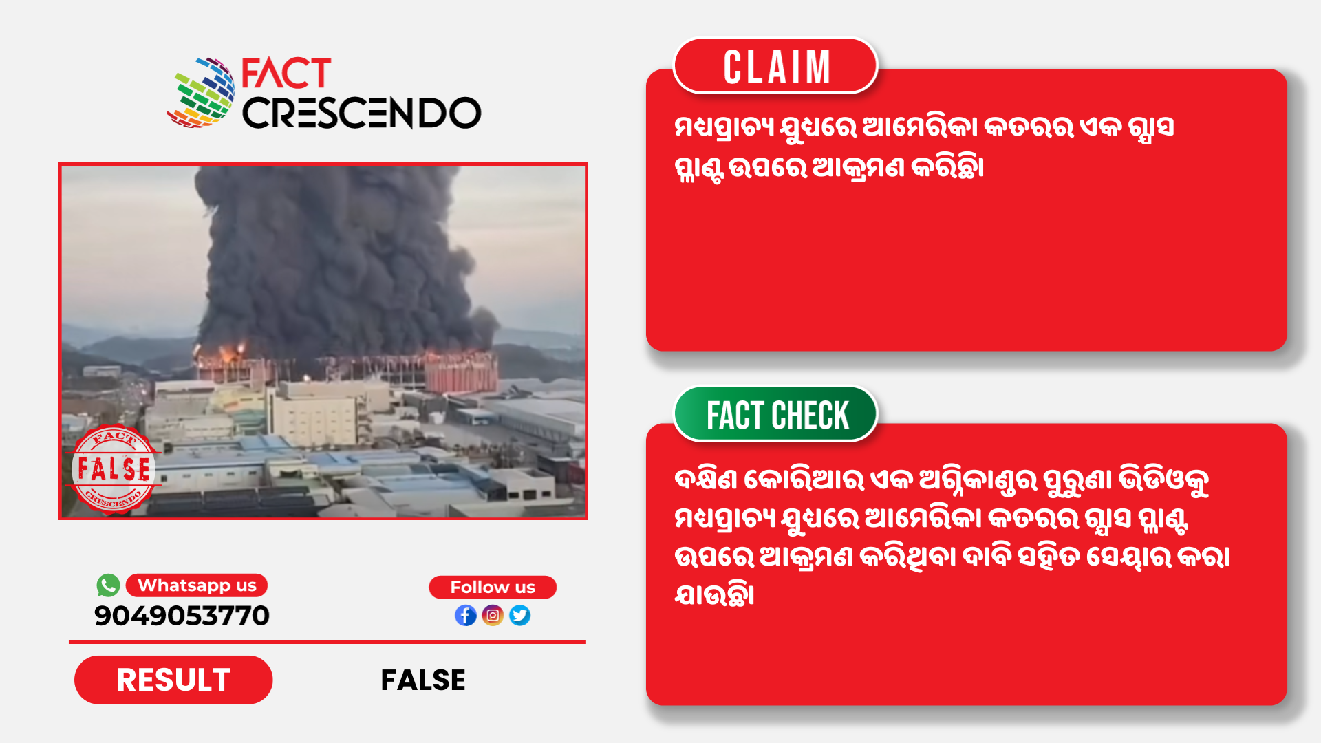 କିନ୍ତୁ ଫ୍ୟାକ୍ଟ କ୍ରିଷେଣ୍ଡୋ ଭାଇରାଲ ଦାବିକୁ ମିଥ୍ୟା ବୋଲି ଜାଣିବାକୁ ପାଇଲା। ଦକ୍ଷିଣ କୋରିଆର ଏକ ଅଗ୍ନିକାଣ୍ଡର ପୁରୁଣା ଭିଡିଓକୁ ମଧ୍ୟପ୍ରାଚ୍ୟ ଯୁଧ୍ୟରେ ଆମେରିକା କତରର ଗ୍ଯାସ ପ୍ଳାଣ୍ଟ ଉପରେ ଆକ୍ରମଣ କରିଥିବା ଦାବି ସହିତ ସେୟାର କରା ଯାଉଛି।