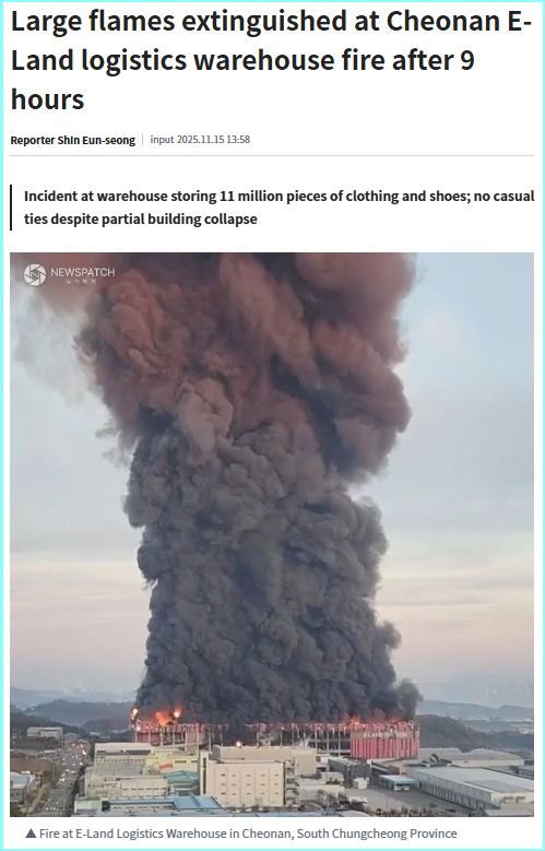 ଦକ୍ଷିଣ କୋରିଆର ନ୍ୟୁଜ୍ ୱେବସାଇଟ୍, ନ୍ୟୁଜପ୍ୟାଚ୍ ର ରିପୋର୍ଟ ଅନୁଯାୟୀ, ଇ-ଲ୍ୟାଣ୍ଡ ଲଜିଷ୍ଟିକ୍ସ ଗୋଦାମରେ ଏହି ନିଆଁ ଲାଗିଥିଲା, ଯାହା ପୋଷାକ ଏବଂ ଜୋତାରେ ପରିପୂର୍ଣ୍ଣ ଥିଲା। ପ୍ରାୟ ନଅ ଘଣ୍ଟା ପରେ ନିଆଁକୁ ନିୟନ୍ତ୍ରଣ କରାଯାଇଥିଲା ଏବଂ କାହାରି ଜୀବନକୁ କୌଣସି କ୍ଷତି ହୋଇନଥିଲା।