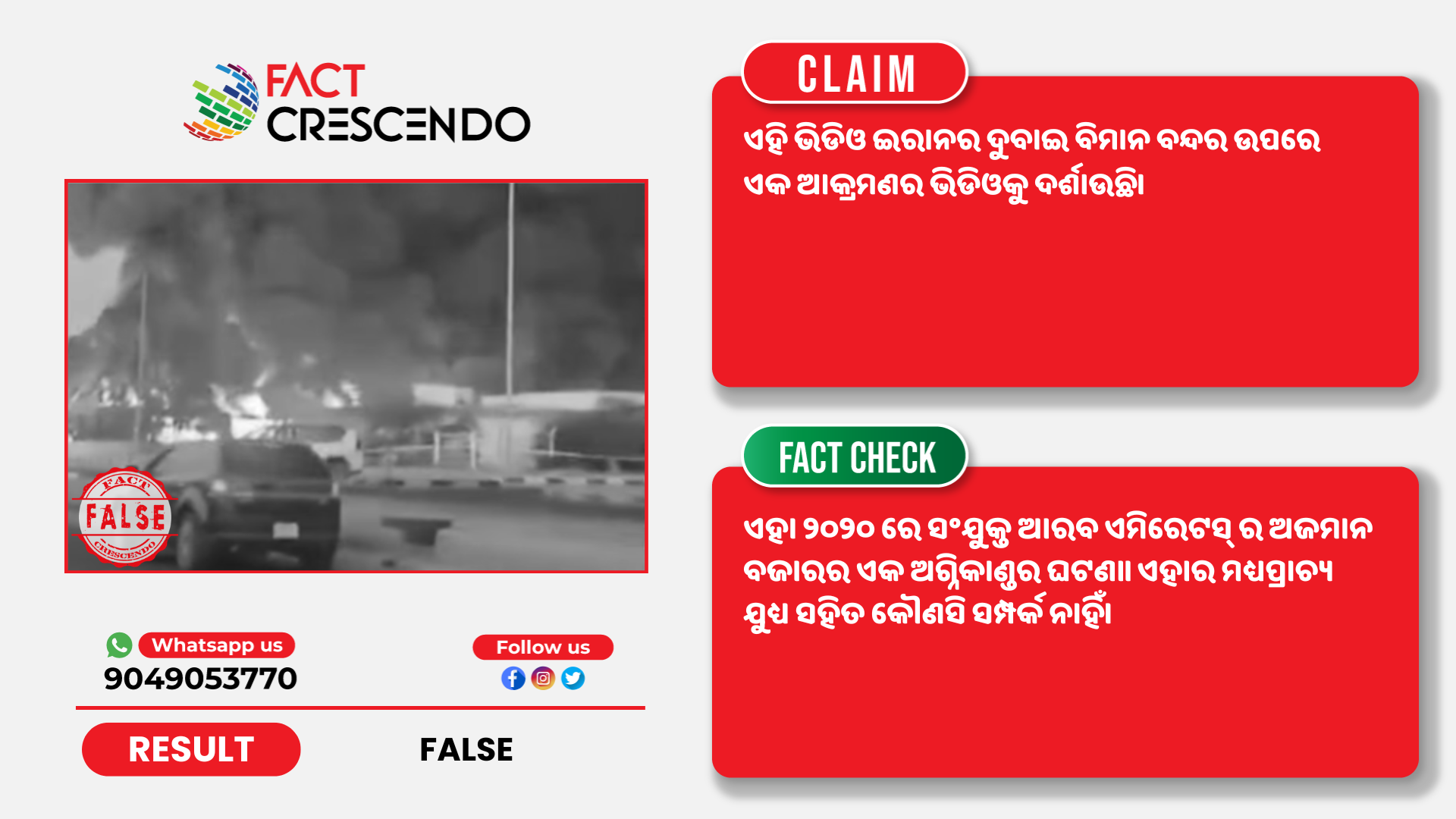 ଆମ ଅନୁସନ୍ଧାନରୁ ପ୍ରମାଣିତ ହେଲା ଯେ ଭାଇରାଲ ଦାବି ମିଥ୍ୟା ଅଟେ। ଏହା ୨୦୨୦ ରେ ସଂଯୁକ୍ତ ଆରବ ଏମିରେଟସ୍ ର ଅଜମାନ ବଜାରର ଏକ ଅଗ୍ନିକାଣ୍ଡର ଘଟଣା। ଏହାର ମଧ୍ୟପ୍ରାଚ୍ୟ ଯୁଧ୍ୟ ସହିତ କୌଣସି ସମ୍ପର୍କ ନାହିଁ।