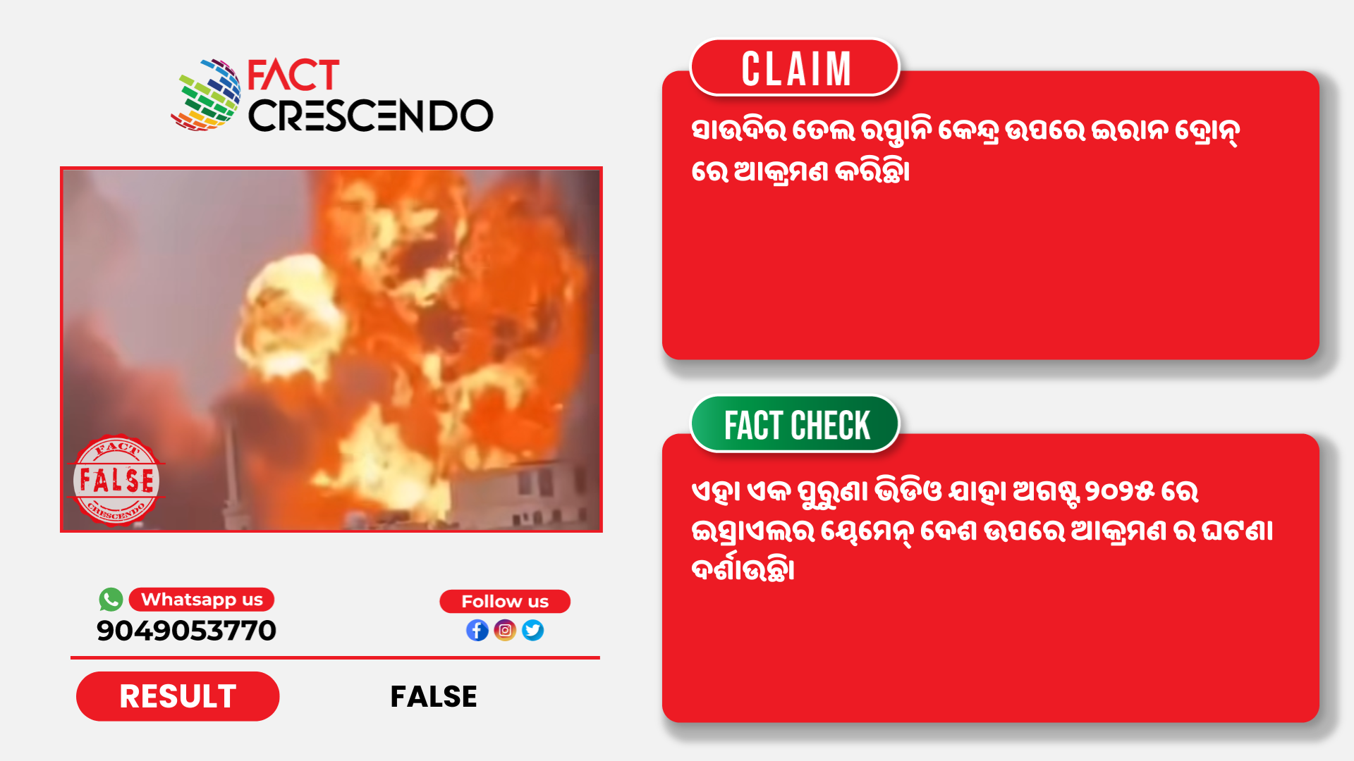 କିନ୍ତୁ ଫ୍ୟାକ୍ଟ କ୍ରିଷେଣ୍ଡୋ ଭାଇରାଲ ଦାବିକୁ ମିଥ୍ୟା ବୋଲି ଜାଣିବାକୁ ପାଇଲା। ଏହା ୨୦୨୫ ରେ ଇସ୍ରାଏଲର ୟେମେନ ଉପରେ ଆକରାମନର ଏକ ପୁରୁଣା ଭିଡିଓ ଯାହାକୁ ସମ୍ପ୍ରତି ମଧ୍ୟପ୍ରାଚ୍ୟ ଯୁଧ୍ୟ ଘଟଣା ଦାବି ସହିତ ସେୟାର କରା ଯାଉଛି।