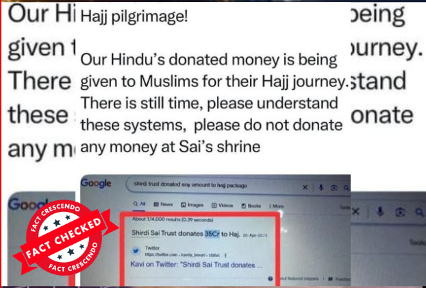 ସୋସିଆଲ ମିଡିଆରେ ଏକ ପୋଷ୍ଟ ଭାଇରାଲ ହେଉଛି ଯେଉଁଥିରେ ଦାବି କରା ଯାଇଛି ଯେ ଶିରିଡି ସାଇ ବାବା ଟ୍ରଷ୍ଟ ପକ୍ଷରୁ ହଜ୍ କମିଟିକୁ ୩୫ କୋଟି ଟଙ୍କାର ଦାନ ଦିଆଯାଇଛି। ୟୁଜର ମାନେ ପୋଷ୍ଟ ସେୟାର କରି ନିଜ ନିରାଶା ପ୍ରକାଶ କରିଛନ୍ତି ଯେ ହିନ୍ଦୁ ମାନଙ୍କର ଦାନକୁ ମୁସ୍ଲିମ ମାନଙ୍କୁ ଦିଆ ଯାଉଛି।