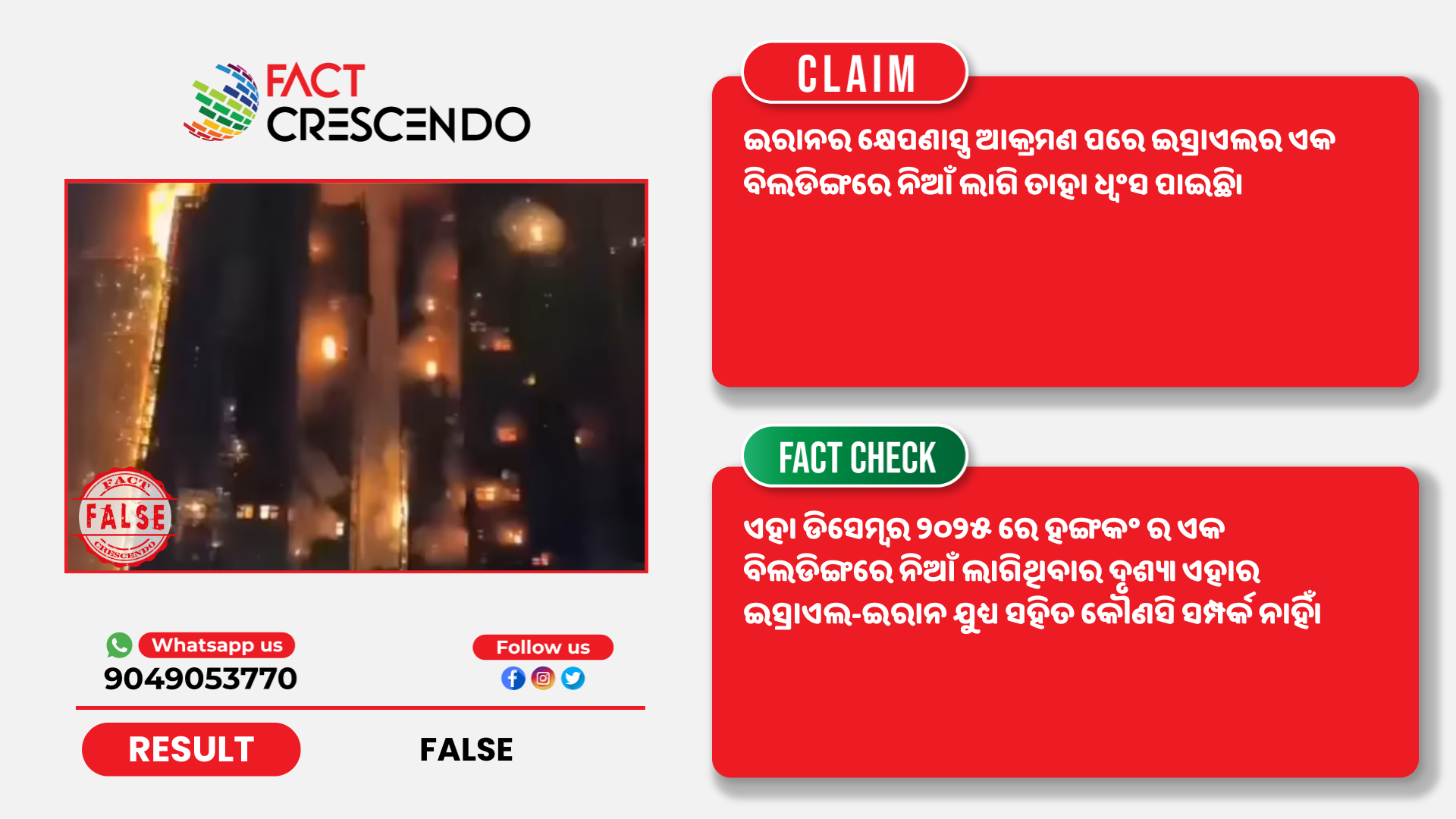 କିନ୍ତୁ ଫ୍ୟାକ୍ଟ କ୍ରିଷେଣ୍ଡୋ ଭାଇରାଲ ଦାବିକୁ ମିଥ୍ୟା ବୋଲି ପାଇଲା। ହଙ୍ଗକଂ ର ଏକ ଉଚ୍ଚ ବିଲଡିଙ୍ଗରେ ନିଆଁ ଲାଗିଥିବା ଭିଡିଓକୁ ଇରାନର ଆକ୍ରମଣ ପରେ ଇସ୍ରାଏଲର ଦୃଶ୍ୟ ଦାବି ସହିତ ସେୟାର କରା ଯାଉଛି।