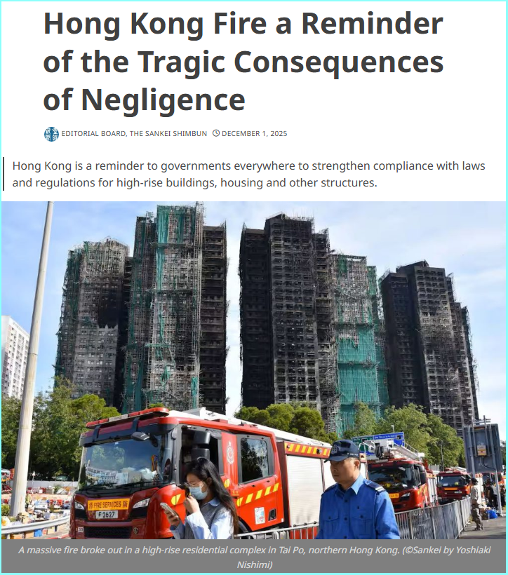 ଅନ୍ୟ ଏକ ରିପୋର୍ଟ ଅନୁଯାୟୀ, ହଙ୍ଗକଂର ଏକ କୋଠାରେ ଅଗ୍ନିକାଣ୍ଡ ଘଇଥିଲା ଯାହା ଦ୍ରୁତ ଗତିରେ ବ୍ୟାପିଗଲା। ଏଥିରେ ଅନେକ ଲୋକ ମୃତ୍ୟୁ ଏବଂ ଆହତ ହୋଇଥିଲେ। କୋଠାର ନିର୍ମାଣରେ ଜ୍ୱଳନଶୀଳ ସାମଗ୍ରୀର ବ୍ୟବହାର କରା ଯାଇଥିଲା, ଯାହା ହେତୁ ପରିସ୍ଥିତି ଆହୁରି ଖରାପ ହୋଇଥିଲା। କାର୍ଯ୍ୟକାରିତାରେ ତ୍ରୁଟି ଏବଂ ସୁରକ୍ଷା ନିୟମ ପାଳନ କରିବାରେ ବିଫଳତା ଏହି ଦୁଃଖଦ ପରିସ୍ଥିତିକୁ ବୃଦ୍ଧି କରିଥିଲା।
