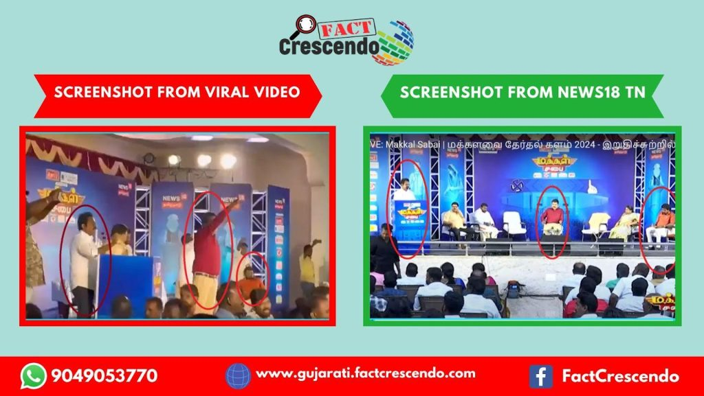ଯେତେବେଳେ ଆମେ ଭାଇରାଲ୍ ଭିଡିଓକୁ ଯତ୍ନର ସହ ଦେଖିଲୁ, ଆମେ ଦେଖିବାକୁ ପାଇଲୁ ଯେ ଷ୍ଟେଜ୍ ବ୍ୟାନରରେ ‘ନ୍ୟୁଜ୍ 18’ ଏବଂ ସେଥିରେ କିଛି ତାମିଲ୍ ଅକ୍ଷର ଲେଖା ଅଛି। ଅଧିକ ଅନୁସନ୍ଧାନରେ, ଆମେ ଜାଣିଲୁ ଯେ ତାମିଲନାଡୁ ରାଜ୍ୟର ବିଭିନ୍ନ ସହରରେ ନ୍ୟୁଜ୍ ୧୮ “ମକ୍କାଲ ସଭା” ନାମକ ଏକ ବିତର୍କ କରିଥିଲା। ନ୍ଯୁଜ ୧୮ ତାମିଲନାଡୁ, ୬ ଏପ୍ରିଲ ୨୦୨୪ ରେ କାଞ୍ଚିପୁରମରେ ମକ୍କାଲ ସଭା ଆୟୋଜନ କରିଥିଲା ଯାହାକୁ ଆପଣ ନିମ୍ନରେ ଦେଖିପାରିବେ।