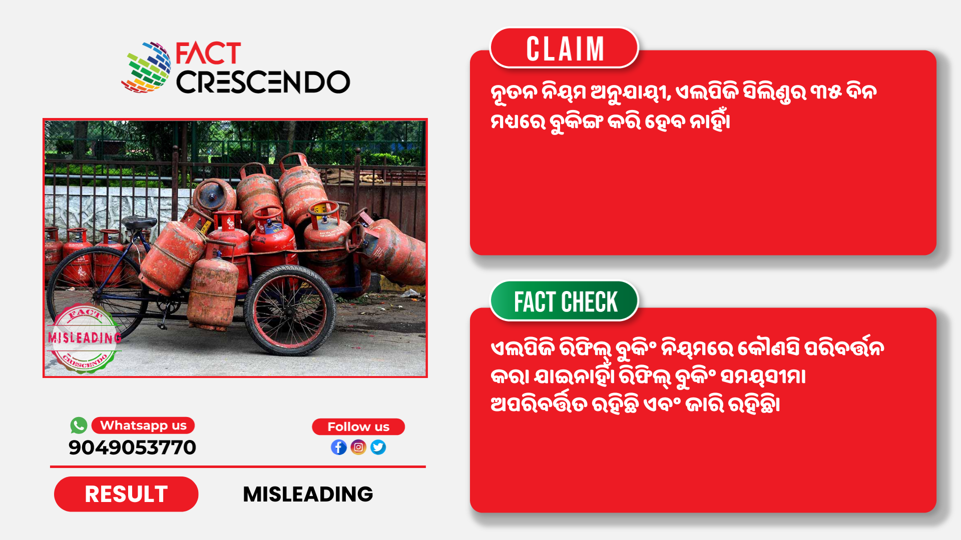 କିନ୍ତୁ ଫ୍ୟାକ୍ଟ କ୍ରିଷେଣ୍ଡୋ ଭାଇରାଲ ଦାବିକୁ ବିଭ୍ରାନ୍ତକାରୀ ବୋଲି ଜାଣିବାକୁ ପାଇଲା। ଏଲପିଜି ରିଫିଲ୍ ବୁକିଂ ନିୟମରେ କୌଣସି ପରିବର୍ତ୍ତନ କରା ଯାଇନାହିଁ। ରିଫିଲ୍ ବୁକିଂ ସମୟସୀମା ଅପରିବର୍ତ୍ତିତ ରହିଛି ଏବଂ ଜାରି ରହିଛି।