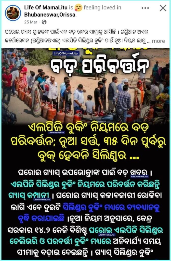 ଆମେରିକା, ଇସ୍ରାଏଲ ଏବଂ ଇରାନ ମଧ୍ୟରେ ସାମ୍ପ୍ରତିକ ବିବାଦ ପରେ ଏଲପିଜିର ଅଭାବ ଦେଖାଦେଇଛି ବୋଲି ଗୁଜବ ଉଠିଛି। ଏହି ପ୍ରସଙ୍ଗରେ, ସୋସିଆଲ ମିଡିଆରେ ଏକ ପୋଷ୍ଟ ଭାଇରାଲ ହେଉଛି। ପୋଷ୍ଟ ଅନୁଯାୟୀ, ଏଲପିଜି ରିଫିଲ୍ ବୁକିଂ ସମୟସୀମା ପ୍ରଚଳନ କରାଯାଇଛି। ସମୟସୀମା ଅନୁଯାୟୀ, କେବଳ ୩୫ ଦିନ ପରେ ସିଲିଣ୍ଡର ବୁକ୍ କରାଯାଇପାରିବ। କିଛି ପୋଷ୍ଟ ଅନୁଯାୟୀ, ସଂଶୋଧିତ ଏଲପିଜି ରିଫିଲ୍ ବୁକିଂ ସମୟସୀମା ହେଉଛି: ସିଙ୍ଗଲ୍ ସିଲିଣ୍ଡର ପାଇଁ ୨୫ ଦିନ ଏବଂ ଡବଲ୍ ସିଲିଣ୍ଡର ପାଇଁ ୩୫ ଦିନ ନିଶ୍ଚିତ କରା ଯାଇଛି।