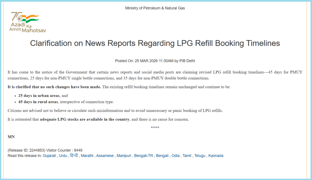 ବିଭିନ୍ନ ମୁଖ୍ୟଶବ୍ଦ ବ୍ୟବହାର କରି ସର୍ଚ୍ଚ କରିବା ପରେ ଆମକୁ ୨୫ ମାର୍ଚ୍ଚ ୨୦୨୬ ରେ PIB ୱେବସାଇଟରେ ଏକ ପ୍ରେସ୍ ରିଲିଜ୍ ମିଳିଲା। ଭାଇରାଲ୍ ଦାବିକୁ ଖଣ୍ଡନ କରି, ପେଟ୍ରୋଲିୟମ୍ ଏବଂ ପ୍ରାକୃତିକ ଗ୍ୟାସ୍ ମନ୍ତ୍ରଣାଳୟ କହିଛି ଯେ ନିୟମରେ ଏପରି କୌଣସି ପରିବର୍ତ୍ତନ କରାଯାଇ ନାହିଁ। ରିଫିଲ୍ ବୁକିଂ ସମୟସୀମା ଅପରିବର୍ତ୍ତିତ ରହିଛି ଏବଂ ଜାରି ରହିଛି: ସହରାଞ୍ଚଳରେ ୨୫ ଦିନ ଏବଂ ଗ୍ରାମାଞ୍ଚଳରେ ୪୫ ଦିନ।