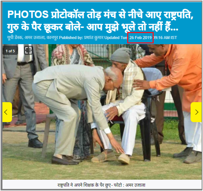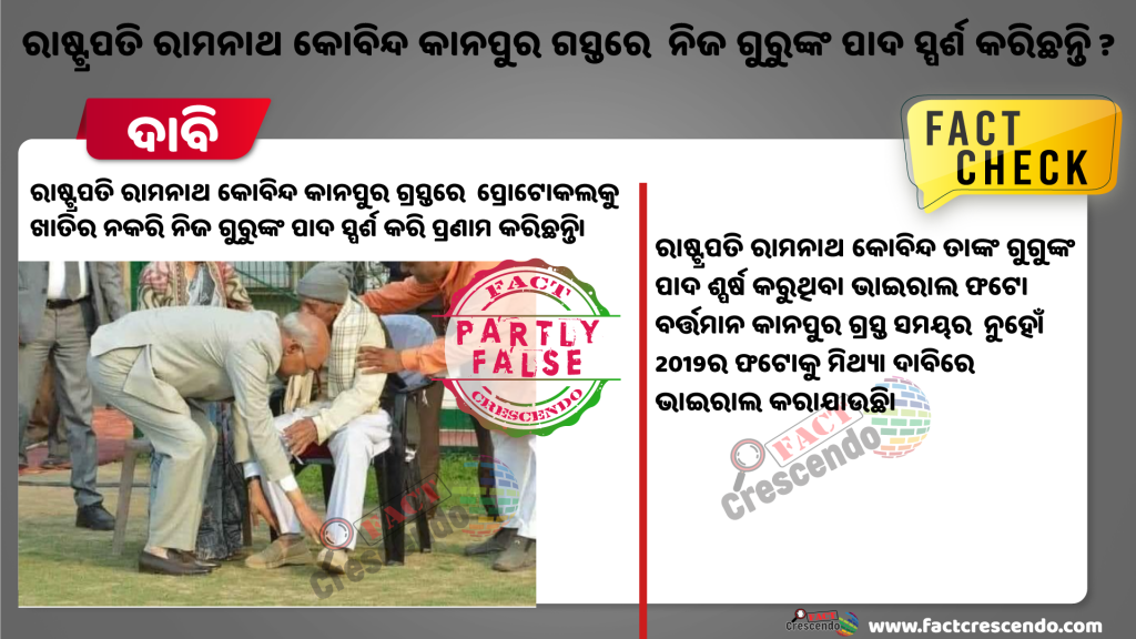 ଅନୁସନ୍ଧାନରେ ଆମେ ସ୍ପଷ୍ଟ ହେଲୁ ଯେ, ରାଷ୍ଟ୍ରପତି ରାମନାଥ କୋବିନ୍ଦ ତାଙ୍କ ଗୁଗୁଙ୍କ ପାଦ ଶ୍ପର୍ଷ କରୁଥିବା ଭାଇରାଲ ଫଟୋ ବର୍ତ୍ତମାନ କାନପୁର ଗ୍ରସ୍ତ ସମୟର କିମ୍ବା କୋରୋନା ସମୟର ନୁହେଁ। 2019ର ଫଟୋକୁ ମିଥ୍ୟା ଦାବିରେ ଭାଇରାଲ କରାଯାଉଛି।