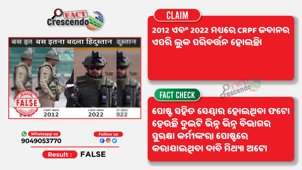 ନୂଆ ବର୍ଷର ପ୍ରଥମ ଦିନରେ ସୋସିଆଲ ମିଡିଆରେ ଏନେକ ପୋଷ୍ଟ ଅଲଗା ଅଲଗା ଦାବିରେ ଭାଇରାଲ ହେବାରେ ଲାଗିଛି। 1 ଜାନୁଆରୀ 2022 ରୁ ଅନେକ ଭାଇରାଲ୍ ଟ୍ୱିଟ୍ ଦାବି କରିଛି ଯେ ଗତ ଦଶନ୍ଧି ମଧ୍ୟରେ ଭାରତର ସର୍ବବୃହତ କେନ୍ଦ୍ରୀୟ ସଶସ୍ତ୍ର ପୋଲିସ୍ ଫୋର୍ସ – CRPF ଏକ ଗିଅର୍ ଅପଗ୍ରେଡ୍ କରିଛି। CRPF ଜବାନ 2011 Vs CRPF ଜବାନ 2022 ମଧ୍ୟରେ ବୁଦ୍ଧିମାନ ଭାରତ ବାଛନ୍ତୁ। ଭାଇରାଲ ଫଟୋ ଦୁଇଟି CRPF କର୍ମଚାରୀଙ୍କ ବୋଲି ଦାବିର କରାଯାଉଛି। ଆମ ଅନୁସନ୍ଧାନରେ ଭାଇରାଲ ଫଟୋ ସହ କରାଯାଇଥିବା ଦାବି ମିଥ୍ୟା ପ୍ରମାଣିତ ହେଲା।