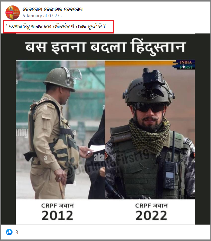 Vikas K Singh ନାମକ ଜଣେ ଫେସବୁକ ୟୁଜର ଭାଇରାଲ ଫଟୋ ପୋଷ୍ଟ କରିଛନ୍ତି। ପୋଷ୍ଟରେ ଦାବି କରାଯାଇଛି ଯେ, କେମିତିକା ଭାରତ ଦରକାର…. ବାସ ଏତିକି ବଦଳିଛି ଭାରତ…. CRPF ଜବାନ 2011 Vs CRPF ଜବାନ 2022। ଆମ ଅନୁସନ୍ଦାନ ପୂର୍ବରୁ ପୋଷ୍ଟକୁ ଅନେକଥର ସେୟାର କରାଯିବା ସହ ପୋଷ୍ଟକୁ ଅନେକ ଲାଇକ ଏବଂ କମେଣ୍ଟ ମଧ୍ୟ ମିଳିଛି। ତଳେ ପୋଷ୍ଟର ଲିଙ୍କ ଦେଖନ୍ତୁ।