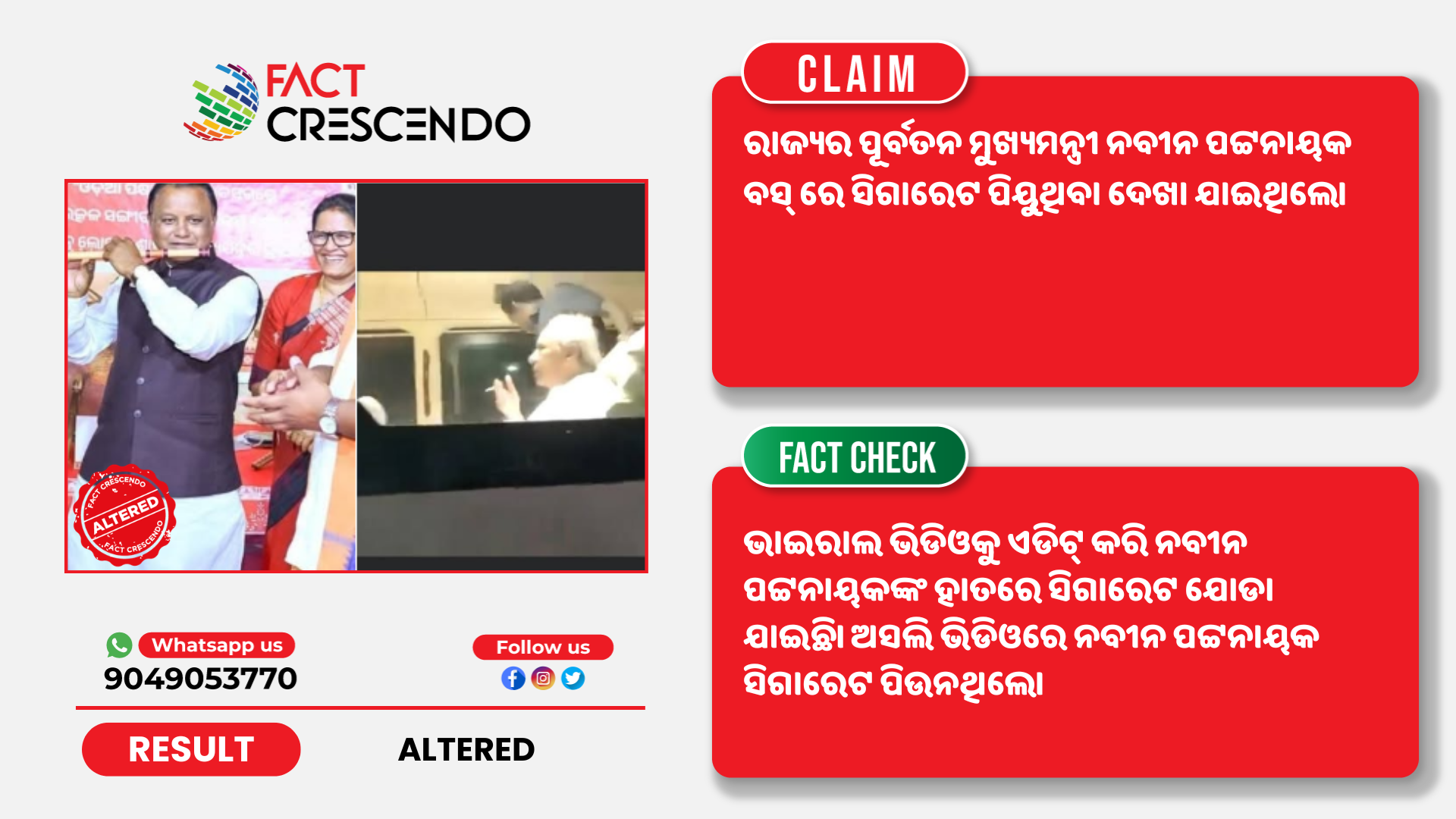 କିନ୍ତୁ ଫ୍ୟାକ୍ଟ କ୍ରିଷେଣ୍ଡୋ ଭାଇରାଲ ଦାବିକୁ ମିଥ୍ୟା ବୋଲି ପାଇଲା। ଭାଇରାଲ ଭିଡିଓକୁ ଏଡିଟ୍ କରି ନବୀନ ପଟ୍ଟନାୟକଙ୍କ ହାତରେ ସିଗାରେଟ ଯୋଡା ଯାଇଛି। ଅସଲି ଭିଡିଓରେ ନବୀନ ପଟ୍ଟନାୟକ ସିଗାରେଟ ପିଉନଥିଲେ।