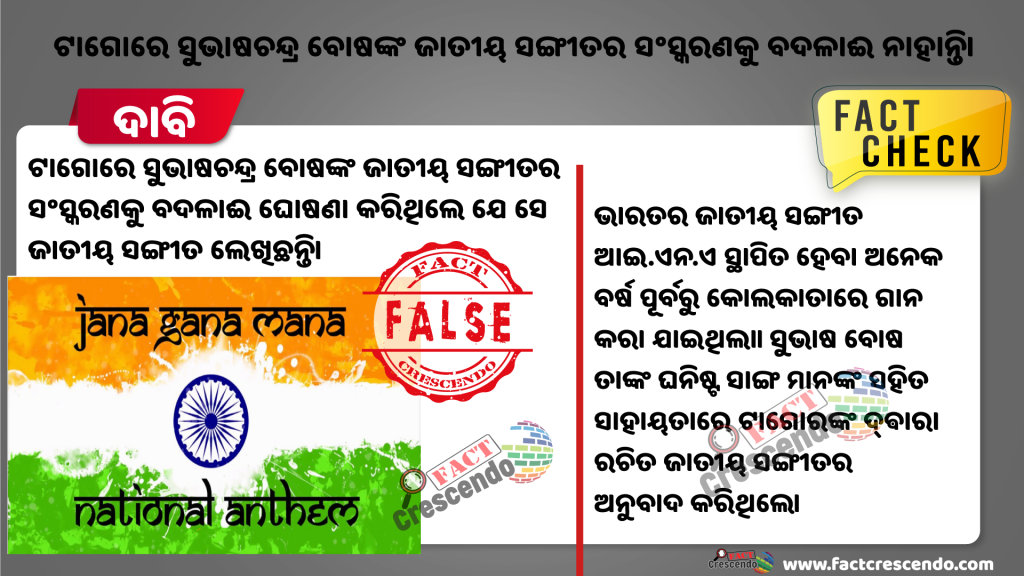 ଜାତୀୟ ସଙ୍ଗୀତ ହେଉଛି ଗୋଟିଏ ଦେଶର ଗର୍ବ। ସମସ୍ତଦେଶର ଜାତୀୟ ସଙ୍ଗୀତ ପଛରେ ସେହି ଦେଶର ଇତିହାସ ଯୁଡ଼ି ହୋଇ ରହି ଥାଏ। ଆମେ ମଧ୍ୟ ଛୁଆ ସମୟରୁ ପଢି ଆସିଛୁ ଯେ ଭାରତର ଜାତୀୟ ସଙ୍ଗୀତ ରବୀନ୍ଦ୍ରନାଥ ଟାଗୋର ଲେଖିଛନ୍ତି। କିନ୍ତୁ ବର୍ତମାନ ସୋସିଆଲ ମିଡିଆରେ ଏହି ବିଷୟନେଇ ଗୋଟିଏ ପୋଷ୍ଟ ଭାଇରାଲ ହେଉଥିବା ଦେଖିବାକୁ ମିଳିଛି। ଏହି ପୋଷ୍ଟରେ ଦାବି କରା ଯାଇଅଛି ଯେ ଭାରତର ଜାତୀୟ ସଙ୍ଗୀତ ଟାଗୋର ନୁହେଁ, ସୁଭାଷଚନ୍ଦ୍ର ବୋଷ ଲେଖି ଥିଲେ।