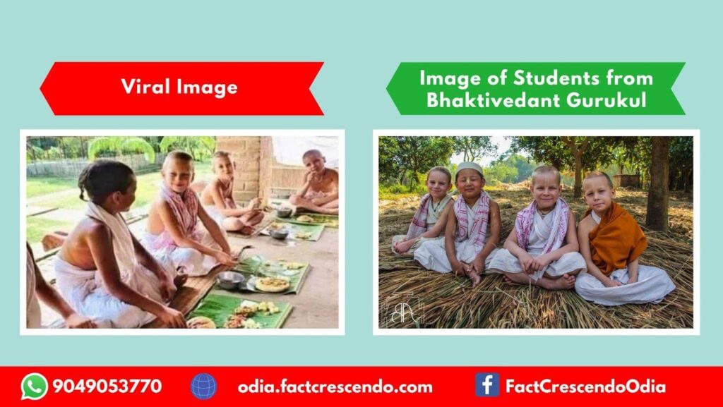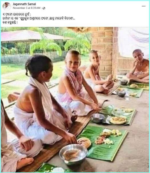 ତଳେ ବସି, ମୁଖରେ ହସ ନେଇ ଏବଂ କଦଳୀ ପାତ୍ରରେ ଭୋଜନ କରୁଥିବା କିଛି ଛୋଟ ପିଲାଙ୍କର ଫୋଟୋ ସୋସିଆଲ ମିଡିଆରେ ଭାଇରାଲ ହେଉଛି। ଦାବି କରା ଯାଉଛି ଯେ ଏହା ଜର୍ମାନୀ ଦେଶରେ ଥିବା ଏକ ଗୁରୁକୁଳ ଆଶ୍ରମର ଫୋଟୋ।