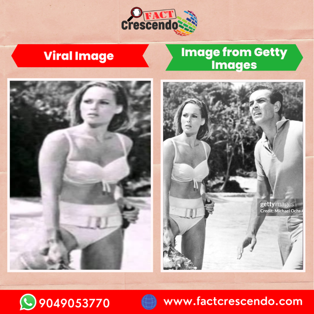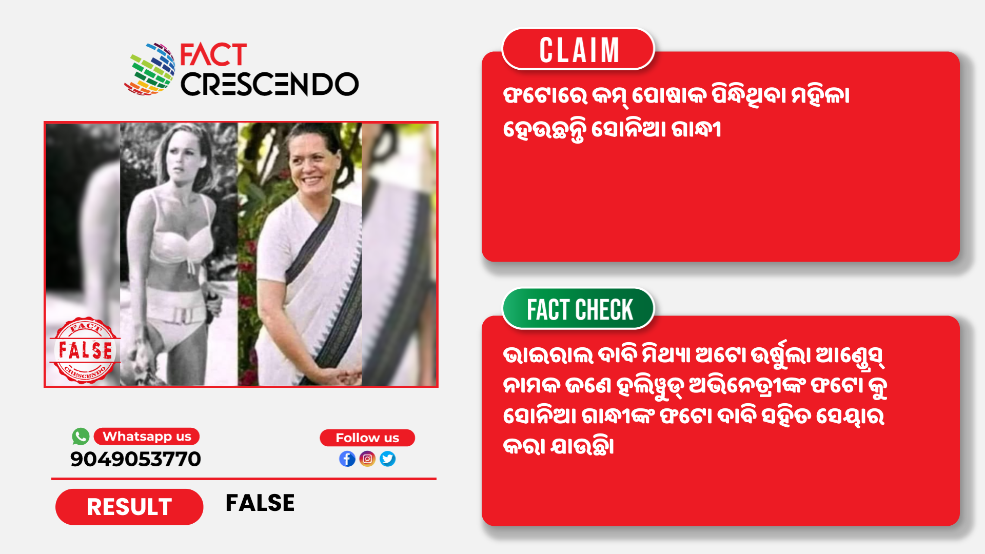 କିନ୍ତୁ ଫ୍ୟାକ୍ଟ କ୍ରିଷେଣ୍ଡୋ ଭାଇରାଲ ଦାବିକୁ ମିଥ୍ୟା ବୋଲି ପାଇଲା। ଭାଇରାଲ ଫଟୋରେ କମ୍ ପୋଷାକ ପିନ୍ଧିଥିବା ମହିଳା ସୋନିଆ ଗାନ୍ଧୀ ନୁହେଁନ୍ତି। ସେ ଜଣେ ହଲିୱୁଡ୍ ଅଭିନେତ୍ରୀ ଏବଂ ତାଙ୍କ ନାମ ହେଉଛି ଉର୍ଷୁଲା ଆଣ୍ଡ୍ରେସ।