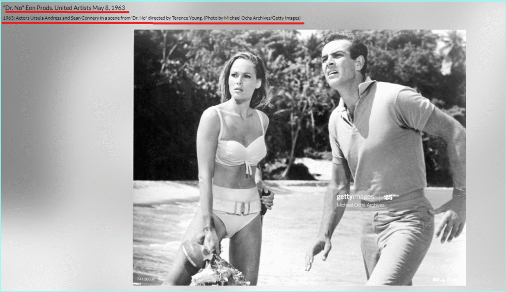 ଅର୍ଥାତ୍ ‘ଡାଃ ନୋ’ ୧୯୬୩ ର ଏକ ହଲିୱୁଡ ସିନେମା ଏବଂ ସିନ୍ କନେରୀ ଏବଂ ଉର୍ସୁଲା ଆଣ୍ଡ୍ରେସ୍ ଯଥାକ୍ରମେ ମୁଖ୍ୟ ଅଭିନେତା ଏବଂ ଅଭିନେତ୍ରୀ ଥିଲେ। ଏଥିରୁ ସ୍ପଷ୍ଟ ହେଉଛି ଯେ, ଫୋଟୋର ବାମ ପାର୍ଶ୍ୱରେ ଥିବା ମହିଳା ହେଉଛନ୍ତି ଅଭିନେତ୍ରୀ ‘ଉରସୁଲା ଆଣ୍ଡରେସ’।