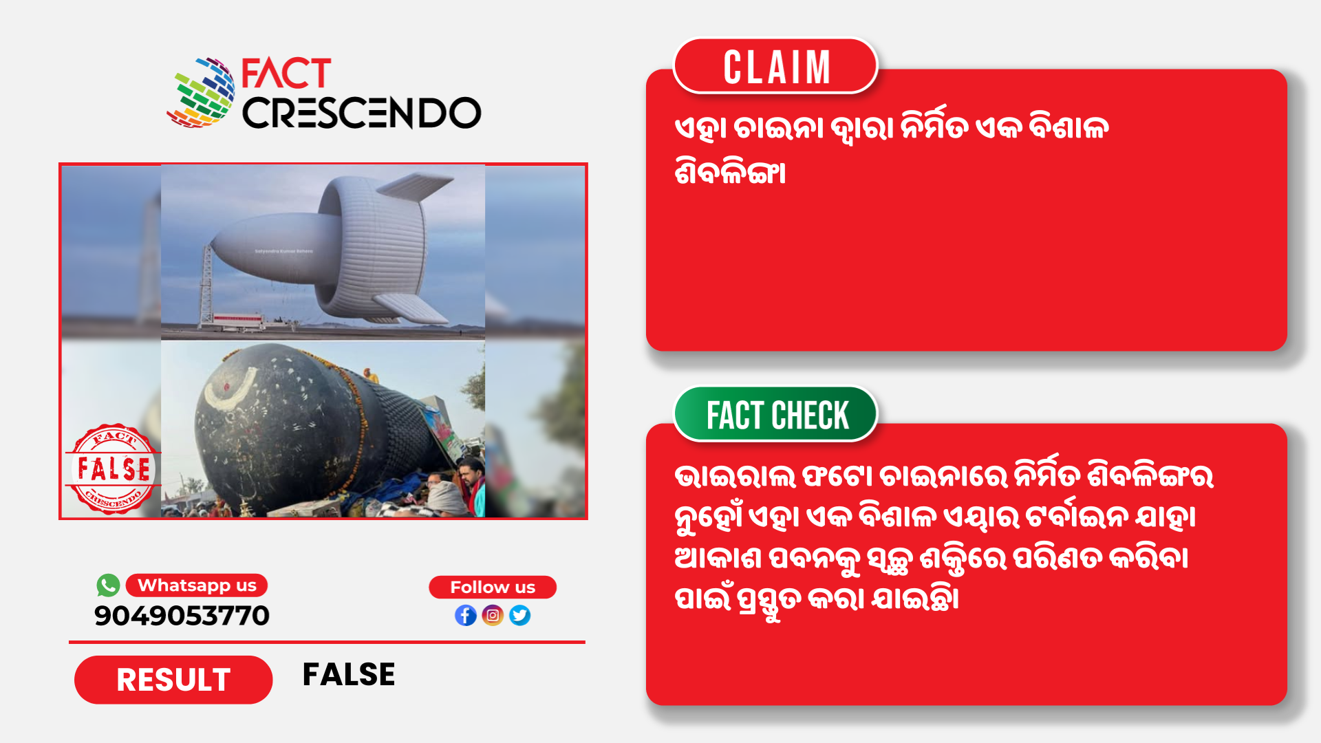 କିନ୍ତୁ ଫ୍ୟାକ୍ଟ କ୍ରିଷେଣ୍ଡୋ ଭାଇରାଲ ଦାବିକୁ ମିଥ୍ୟା ବୋଲି ଜାଣିବାକୁ ପାଇଲା। ଏକ ଏୟାର ଟର୍ବାଇନର ଫଟୋକୁ ଚୀନରେ ନିର୍ମିତ ହୋଥିବା ଶିବଲିଙ୍ଗ ଦାବି ସହିତ ସେୟାର କକରା ଯାଉଛି।