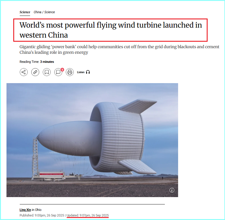 ଆମ ଅନୁସନ୍ଧାନରେ ପ୍ରଥମେ ଆମେ ଭାଇରାଲ ଫଟୋର ରିଭର୍ସ ଇମେଜ୍ ସର୍ଚ୍ଚ କରିଲୁ। ଫଳସ୍ଵରୂପ ଆମକୁ ସମାନ ଫଟୋ ୨୬ ସେପ୍ଟେମ୍ବର ୨୦୨୫ ରେ ସାଉଥ୍ ଚାଇନା ମରନିଙ୍ଗ ପୋଷ୍ଟ ୱେବସାଇଟ ରେ ପ୍ରକାଶିତ ହେଇଥିବା ମିଳିଲା। ରିପୋର୍ଟ ଅନୁଯାୟୀ, ଚୀନ୍ ତାର ପଶ୍ଚିମ ଜିନଜିଆଙ୍ଗ ଅଞ୍ଚଳରେ ବିଶ୍ୱର ସବୁଠାରୁ ଶକ୍ତିଶାଳୀ ଉଡ଼ନ୍ତା ଏୟାର ଟର୍ବାଇନ୍, ଯାହାକୁ “ଏସ ୧୫୦୦” କୁହାଯାଏ, ସଫଳତାର ସହିତ ଉଡ଼ାଣ କରିଥିଲା। ଏହି ବିଶାଳ ଟର୍ବାଇନ୍ ପ୍ରାୟ ଏକ ବାସ୍କେଟବଲ୍ କୋର୍ଟ ଆକାରର ଏବଂ ଏକ ୧୩ ମହଲା କୋଠା ପରି ଉଚ୍ଚ। ଏକ ହିଲିୟମ୍ ପୂର୍ଣ୍ଣ ସେଲ୍ ବ୍ୟବହାର କରି ଆକାଶରେ ଭାସିଥିଲା ଏବଂ ଏକ ପରୀକ୍ଷାମୂଳକ ଉଡ଼ାଣ ସମୟରେ ୧ ମେଗାୱାଟ୍ ବିଦ୍ୟୁତ୍ ଉତ୍ପାଦନ କରିଥିଲା।
