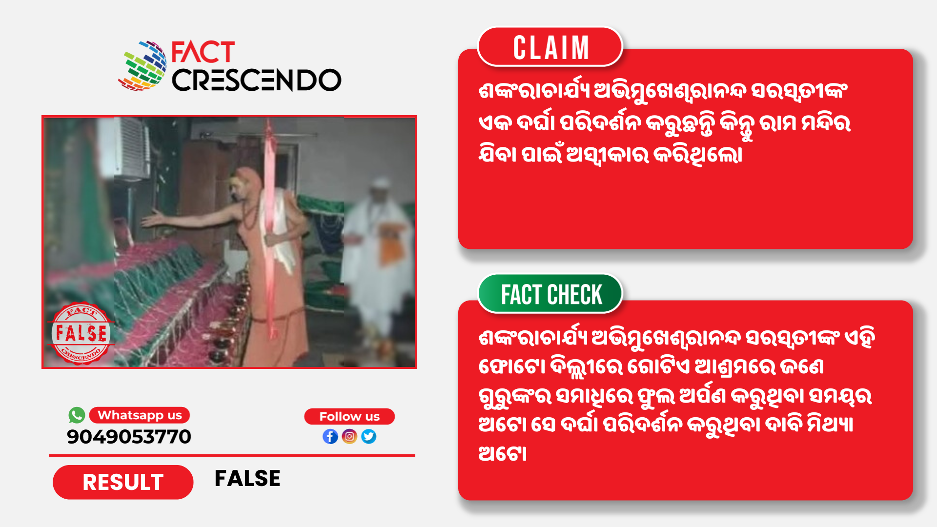 ଆମ ଅନୁସନ୍ଧାନରୁ ପ୍ରମାଣିତ ହେଲା ଯେ ଭାଇରାଲ ଦାବି ମିଥ୍ୟା ଅଟେ। ଶଙ୍କରାଚାର୍ଯ୍ୟ ଅଭିମୁଖେଶ୍ୱରାନନ୍ଦ ସରସ୍ୱତୀଙ୍କ ଏହି ଫୋଟୋ ଦିଲ୍ଲୀରେ ଗୋଟିଏ ଆଶ୍ରମରେ ଜଣେ ଗୁରୁଙ୍କର ସମାଧିରେ ଫୁଲ ଅର୍ପଣ କରୁଥିବା ସମୟର ଅଟେ। ସେ ଦର୍ଘା ପରିଦର୍ଶନ କରୁଥିବା ଦାବି ମିଥ୍ୟା ଅଟେ।
