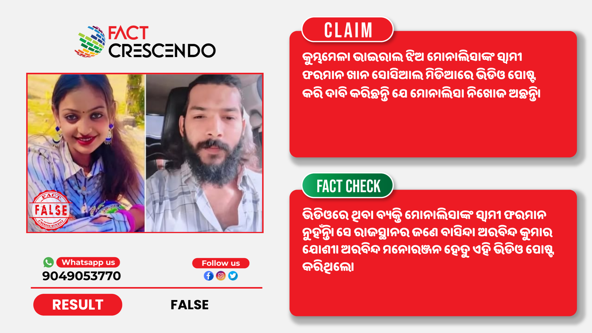 ଆମ ଅନୁସନ୍ଧାନରେ ଭାଇରାଲ ଦାବି ମିଥ୍ୟା ପ୍ରମାଣିତ ହେଇଛି। ଭିଡିଓରେ ଥିବା ବ୍ୟକ୍ତି ମୋନାଲିସାଙ୍କ ସ୍ଵାମୀ ଫରମାନ ନୁହଁନ୍ତି। ସେ ରାଜସ୍ଥାନର ଜଣେ ବାସିନ୍ଦା ଅରବିନ୍ଦ କୁମାର ଯୋଶୀ। ଅରବିନ୍ଦ ମନୋରଞ୍ଜନ ହେତୁ ଏହି ଭିଡିଓ ପୋଷ୍ଟ କରିଥିଲେ।