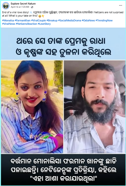 ପୋଷ୍ଟରେ କୁହା ଯାଇଛି, “ଭାଇରାଲ ପ୍ରେମ କାହାଣୀ ସେଶ। ପ୍ରେମରେ ପଡ଼ିଲା ପୂର୍ଣ୍ଣଚ୍ଛେଦ, ଫରମାନଙ୍କ ହାତ ଛାଡିଲେ ମୋନାଲିସା।”