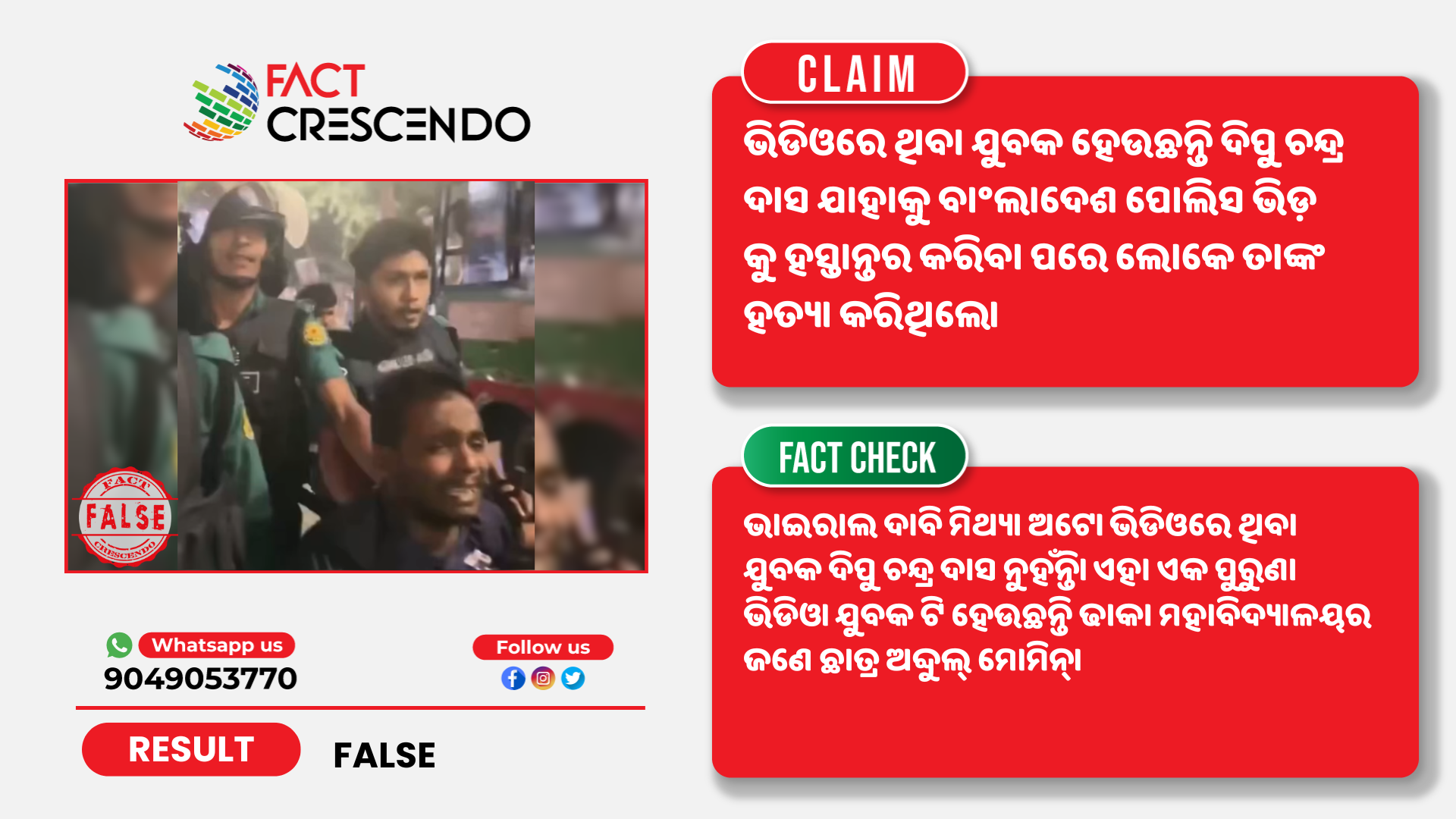 କିନ୍ତୁ ଫ୍ୟାକ୍ଟ କ୍ରିଷେଣ୍ଡୋ ଭାଇରାଲ ଦାବିକୁ ମିଥ୍ୟା ବୋଲି ପାଇଲା। ଭିଡିଓରେ ଥିବା ଯୁବକ ଦିପୁ ଚନ୍ଦ୍ର ଦାସ ନୁହଁନ୍ତି। ଏହା ଏକ ପୁରୁଣା ଭିଡିଓ। ଯୁବକ ଟି ହେଉଛନ୍ତି ଢାକା ମହାବିଦ୍ୟାଳୟର ଜଣେ ଛାତ୍ର ଅବ୍ଦୁଲ୍ ମୋମିନ୍।