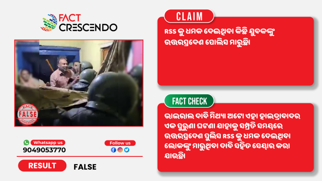 Title:ହାଇଦ୍ରାବାଦର ଏକ ପୁରୁଣା ଘଟଣାକୁ ଉତ୍ତରପ୍ରଦେଶ ପୁଲିସ RSS କୁ ଧମକ ଦେଇଥିବା ଲୋକଙ୍କୁ ମାରୁଥିବା ଦାବି ସହିତ ସେୟାର କରା ଯାଉଛି।
