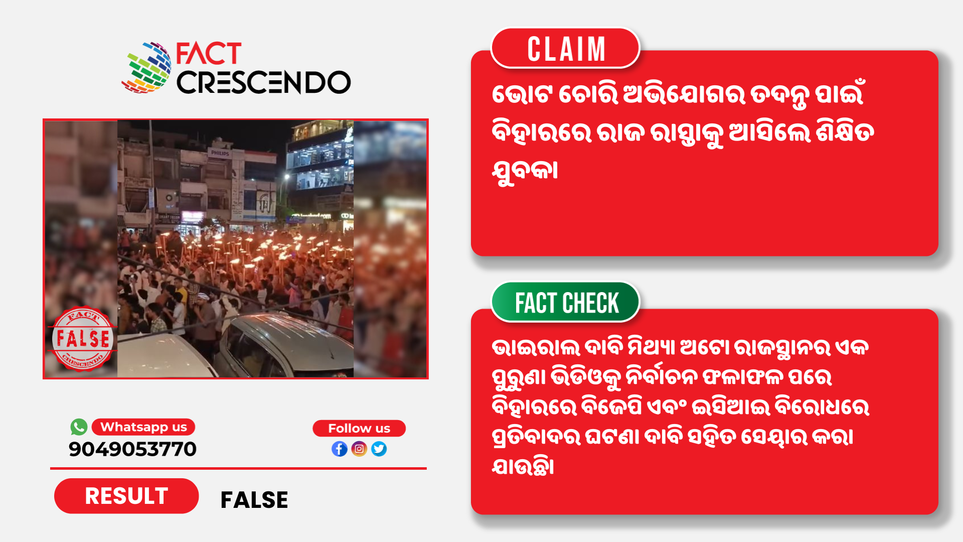 କିନ୍ତୁ ଫ୍ୟାକ୍ଟ କ୍ରିଷେଣ୍ଡୋ ଭାଇରାଲ ଦାବିକୁ ମିଥ୍ୟା ବୋଲି ଜାଣିବାକୁ ପାଇଲା। ଏହା ରାଜସ୍ଥାନ ରାଜ୍ୟର ଏକ ପୁରୁଣା ଘଟଣା ଯାହାକୁ ବିହାର ନିର୍ବାଚନ ସହିତ ଯୋଡ଼ି ସେୟାର କରା ଯାଉଛି।