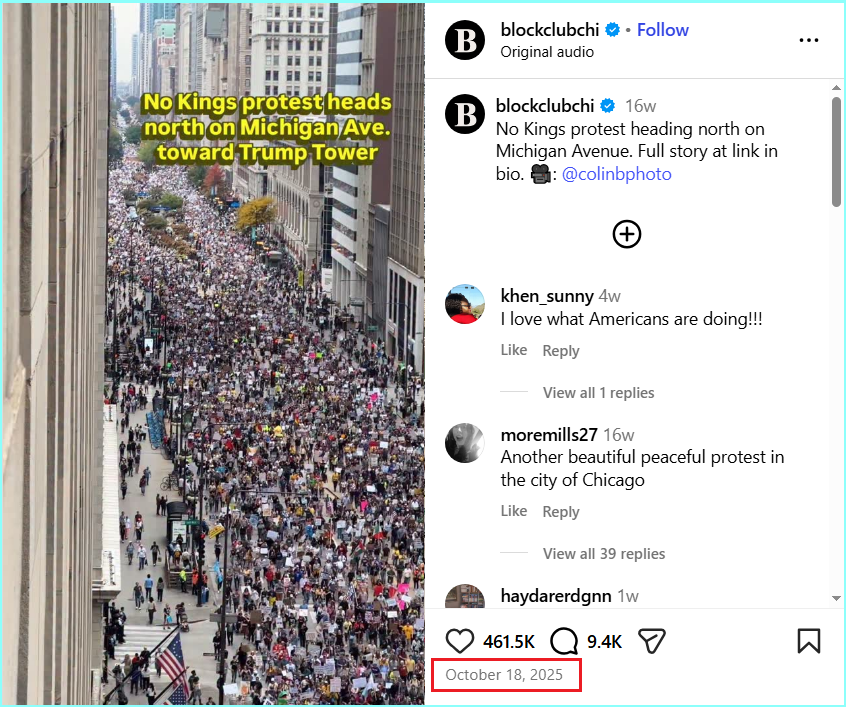 ଭିଡିଓର କ୍ୟାପସନରେ ଲେଖାଯାଇଛି, “ନ୍ୟାସନାଲ ଗାର୍ଡ ସୈନିକଙ୍କ ନିୟୋଜନ ବିରୋଧରେ ପ୍ରତିବାଦକାରୀମାନେ ଲସ୍ ଆଞ୍ଜେଲସ୍ ଏବଂ ଚିକାଗୋର ରାସ୍ତାକୁ ଓହ୍ଲାଇଥିଲେ, ଏହି କାର୍ଯ୍ୟକ୍ରମଟି ଆମେରିକାରେ ପ୍ରଦର୍ଶନ କରିଥିବା “ନୋ କିଙ୍ଗସ୍” ଆନ୍ଦୋଳନର ଅଂଶ ଥିଲା।”