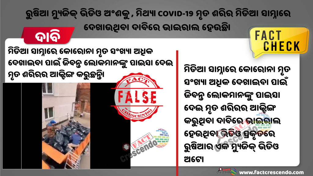 Title:ରୁଷିଆ ମ୍ୟୁଜିକ୍ ଭିଡିଓ ଅଂଶକୁ , ମିଥ୍ୟା COVID-19 ମୃତ ଶରିର ମିଡିଆ ସାମ୍ନାରେ ଦେଖାଉଥିବା ଦାବିରେ ଭାଇରାଲ ହେଉଛି।