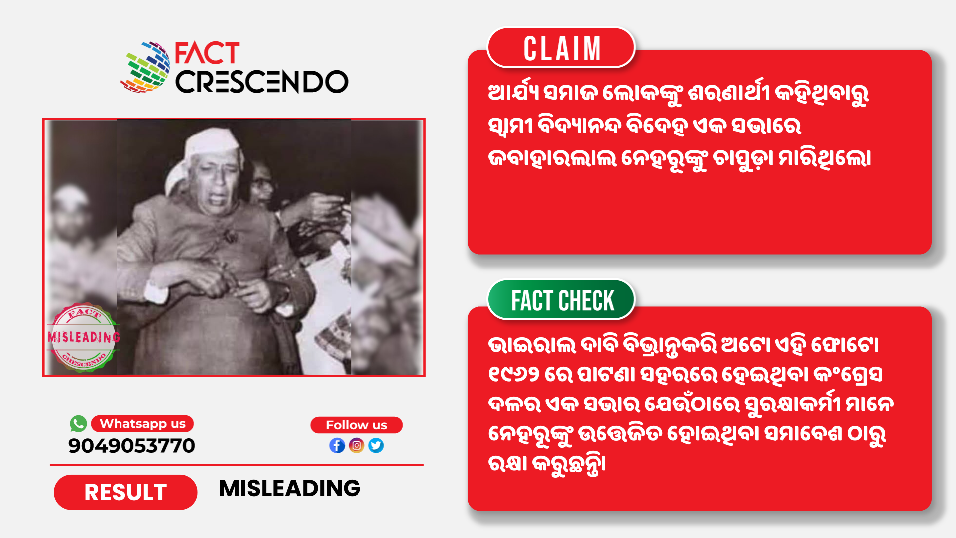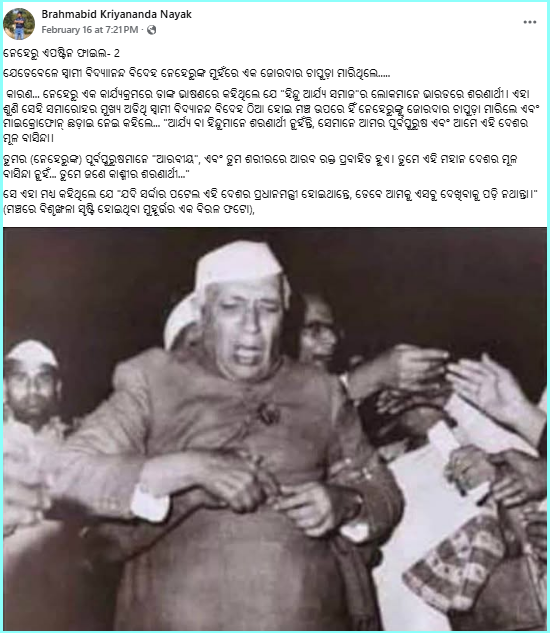 ଭାରତର ପ୍ରଥମ ପ୍ରଧାନମନ୍ତ୍ରୀ ଜବାହରଲାଲ ନେହେରୁଙ୍କ ଏକ ଫଟୋ ସୋସିଆଲ ମିଡିଆରେ ଭାଇରାଲ ହେଉଛି ଯେଉଁଥିରେ ଦାବି କରାଯାଉଛି ଯେ ଏକ କାର୍ଯ୍ୟକ୍ରମରେ ଯେତେବେଳେ ସେ ଆର୍ଯ୍ୟ ହିନ୍ଦୁ ସମାଜକୁ ଭାରତର ଶରଣାର୍ଥୀ ବୋଲି କହିଥିଲେ, ତାଙ୍କୁ ସ୍ୱାମୀ ବିଦ୍ୟାାନନ୍ଦ ଚାପୁଡ଼ା ମାରିଥିଲେ।