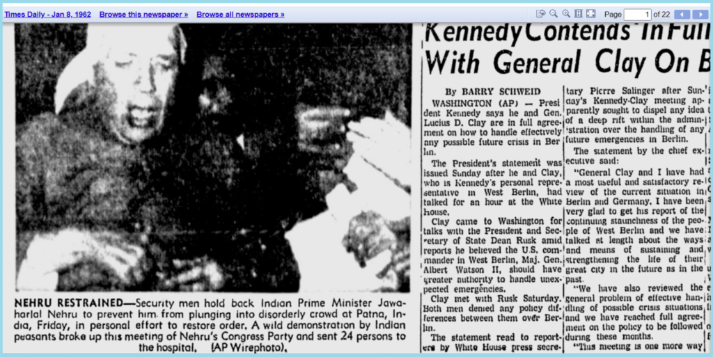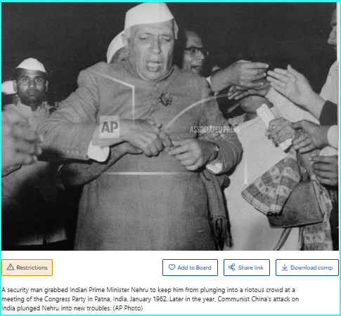 ସମାନ ଫୋଟୋ AP ୱେବସାଇଟରେ ମଧ୍ୟ ପ୍ରକାଶିତ ହେଇଥିଲା। ସୂଚନା ଅନୁଯାୟୀ ଜାନୁଆରୀ 1962 ରେ ଭାରତର ପାଟନାରେ କଂଗ୍ରେସ ଦଳର ଏକ ବୈଠକରେ ଦଙ୍ଗାକାରୀ ଭିଡ଼ରେ ପଶିବାରୁ ରକ୍ଷା ପାଇବା ପାଇଁ ଜଣେ ସୁରକ୍ଷା କର୍ମୀ ଭାରତୀୟ ପ୍ରଧାନମନ୍ତ୍ରୀ ନେହେରୁଙ୍କୁ ଧରିଥିଲେ। ବର୍ଷ ଶେଷ ଭାଗରେ, ଭାରତ ଉପରେ କମ୍ୟୁନିଷ୍ଟ ଚୀନର ଆକ୍ରମଣ ନେହେରୁଙ୍କୁ ନୂତନ ସମସ୍ୟାରେ ପକାଇ ଦେଇଥିଲା।