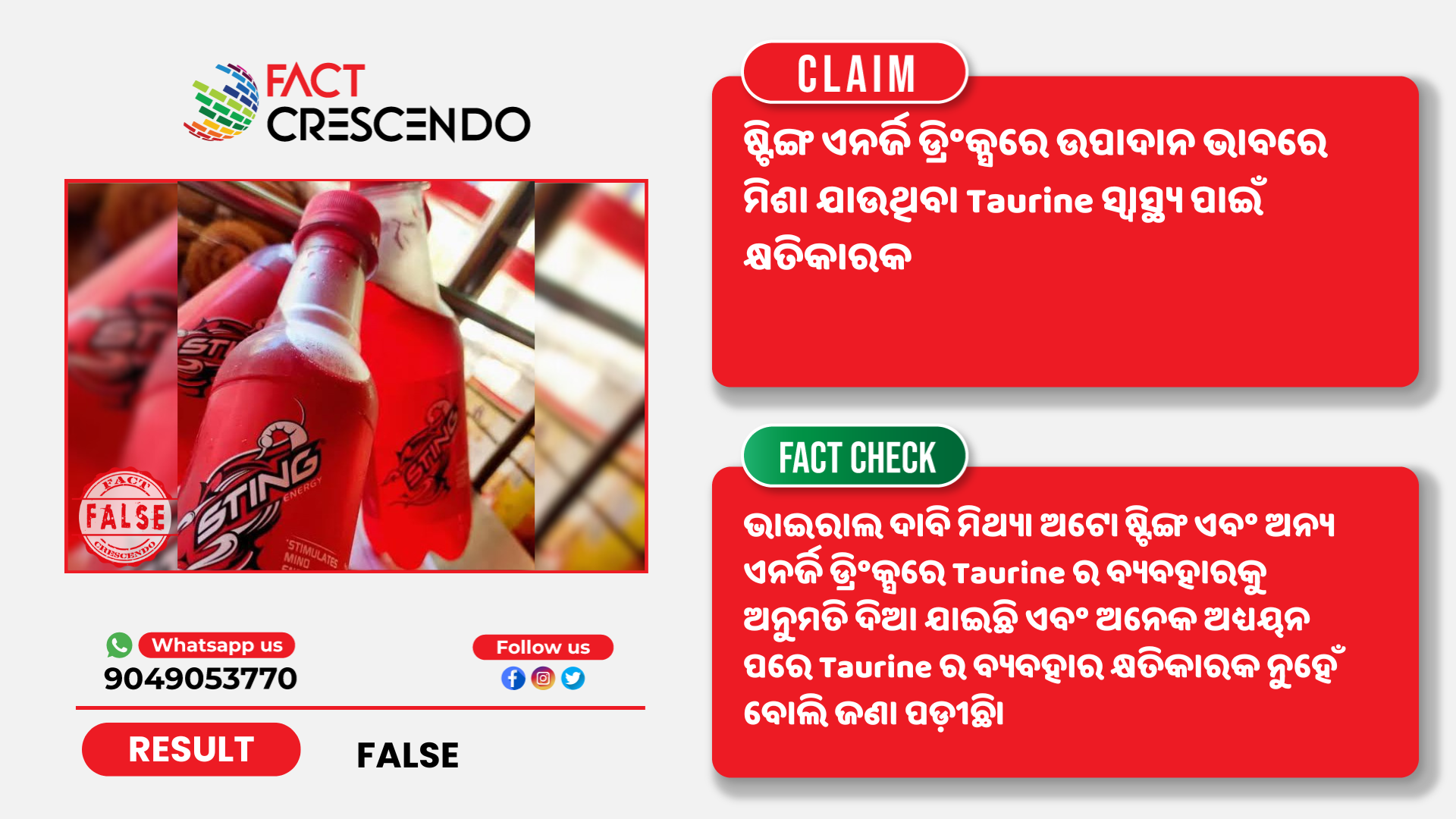 ଆମ ଅନୁସନ୍ଧାନରୁ ପ୍ରମାଣିତ ହେଲା ଯେ ଭାଇରାଲ ଦାବି ମିଥ୍ୟା ଅଟେ। ଷ୍ଟିଙ୍ଗ ଏବଂ ଅନ୍ୟ ଏନର୍ଜି ଡ୍ରିଂକ୍ସରେ Taurine ର ବ୍ୟବହାରକୁ ଅନୁମତି ଦିଆ ଯାଇଛି ଏବଂ ଅନେକ ଅଧ୍ୟୟନ ପରେ Taurine ର ବ୍ୟବହାର କ୍ଷତିକାରକ ନୁହେଁ ବୋଲି ଜଣା ପଡ଼ୀଛି।