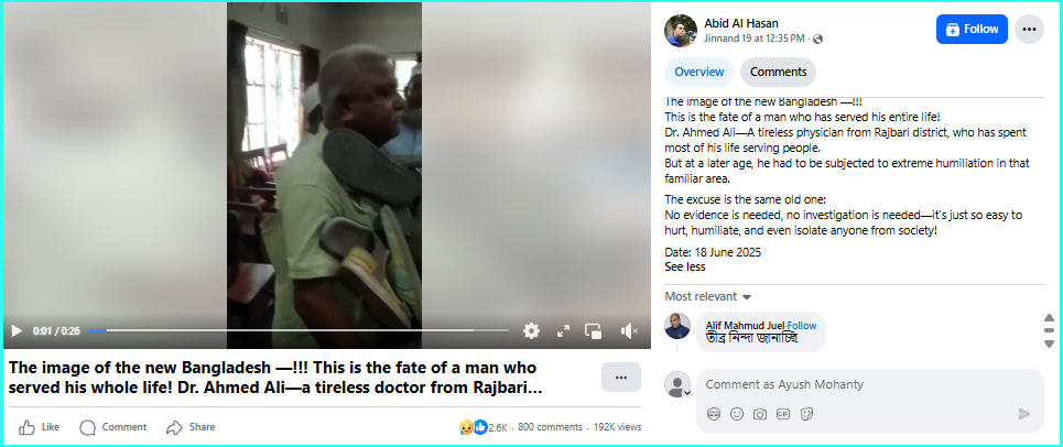 ଆମ ଅନୁସନ୍ଧାନରେ ଭାଇରାଲ ଦାବି ମିଥ୍ୟା ପ୍ରମାଣିତ ହେଲା। ଏହି ଭିଡିଓରେ ଥିବା ବ୍ୟକ୍ତି ବାଂଲାଦେଶର ଜଣେ ଅବସରପ୍ରାପ୍ତ ଚିକିତ୍ସା ଅଧିକାରୀ ଅହମ୍ମଦ ଅଲି। ଇସଲାମର ଭବିଷ୍ଯଦ୍ବକ୍ତାଙ୍କୁ ଅପମାନିତ କରିଥିବାରୁ ସେଠିକାର ଲୋକ ତାଙ୍କ ସହିତ ଏପରି ବ୍ୟବହାର କରିଥିଲେ।
