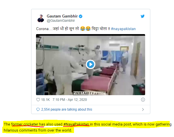 ଆମ ଅନୁସନ୍ଧାନ ଆରମ୍ଭରେ ଆମେ ଭାଇରାଲ ଭିଡିଓକୁ ଇନବିଡ଼ରେ ଭାଙ୍ଗୀ ଇମେଜରେ ଭାଙ୍ଗୀଲୁ। ଫୋଟୋକୁ ଗୁଗୁଲ ସର୍ଚ କରିଲାରୁ । ସର୍ଚରେ India tv ରେ ପ୍ରକାଶିତ ହୋଇଥିବା ଖବର ମିଳିଲା। ଖବରରେ ଭାରତ କ୍ରୀକେଟର ଗୋତମ ଗମ୍ଭୀର ଏହି ଭାଇରାଲ ଭିଡିଓକୁ ନିଜ ଟ୍ୱିଟର ଆକାଉଣ୍ଟରେ ପୋଷ୍ଟ କରିଥାବର ଲେଖା ଯାଇଛି। ଗୋତମ ଗମ୍ଭୀର ନୀଜ ପୋଷ୍ଟରେ ଭିଡିଓ ପାକିସ୍ତାନର ଅଟେ ବୋଲି ଲେଖି ଛନ୍ତି। ପୋଷ୍ଟରେ ନୟା ପାକିସ୍ତାନ ଲେଖିଛନ୍ତି। ଏଥିରୁ ପାଇଲୁ ଯେ, ଭାଇରାଲ ଭିଡିଓ ପାକିସ୍ତାନ ହୋଇଥାଇ ପାରେ। କିନ୍ତୁ ଏହା ସ୍ପଷ୍ଟ କରିବା ପାଇଁ ଆମେ ଅଧିକ ସର୍ଚ କରିଲୁ। ଅଧିକ ସୂଚନା ପାଇଁ ତଳେ ଦେଖନ୍ତୁ।
