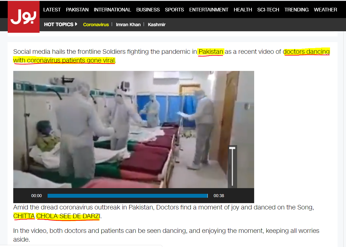 ଏହା ପରେ ଆମକୁ Pkistani news ପେଜରେ 12 ଏପ୍ରିଲରେ ପ୍ରକାଶିତ ହୋଇଥିବା ଏକ ନ୍ୟୁଜ ପାଇଲୁ। ଯେଉଁଥିରେ ଭିଡିଓ ବିଷୟରେ ଲେଖା ଯାଇଛି। ନ୍ୟୁଜଟି Umarulla Hussaini ନାମକ ପାକିସ୍ତାନୀ ସାମ୍ବାଦିକ ଲେଖିଛନ୍ତି। ଖବର ଅନୁସାରେ ପାକିସ୍ତାନୀ ଡାକ୍ତରମାନେ କୋରୋନା ରୋଗୀଙ୍କ ମନୋବଳ ବଢ଼ାଇବା ପାଇଁ ଚିତ୍ତା ଚୋଲା ସି ଦେ ଦର୍ଜି ( CHITTA CHOLA SEE DE DARZI) ନାମକ ଗୀତରେ ନାଚୁଛନ୍ତି। ଭିଡିଓରେ ରୋଗୀ ଏବଂ ଡାକ୍ତର ଦୁହେଁ ନାଚୁଥିବାର ଦେଖା ଯାଉଛନ୍ତି। ତଳେ ଲିଙ୍କ ଦେଖନ୍ତୁ।