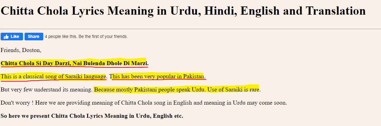 ତେବେ ଆମେ CHITTA CHOLA SEE DE DARZI ପାକିସ୍ତାନର ନା ନାହିଁ ତାହା ଜାଣିବା ପାଇଁ ସର୍ଚ କରିଲୁ। ସର୍ଚ୍ଚରେ ଆମକୁ Enghindi.com ପେଜରେ ଏହାର ବିଷୟରେ ତଥ୍ୟ ମିଳିଲା। ପୋଷ୍ଟରେ ଲେଖା ଯାଇଛି ଯେ Saraiki Language ର ଏହି କ୍ଲାସିକାଲ ଗୀତ ପାକିସ୍ତାନରେ ଲୋକପ୍ରିୟ ଅଟେ। ଏହି ଗୀତ ଉର୍ଦୁ ଭାଷାରେ ଲେଖା ଯାଇଛି। ସାରକି ଭାଷା ପାକିସ୍ତାନ ପଞ୍ଜାବରେ ଥିବା ଲୋକମାନେ କହିଥାନ୍ତି। ଅଧିକ ସୂଚନା ପାଇଁ ତଳେ ପୋଷ୍ଟ ଦେଖନ୍ତୁ।