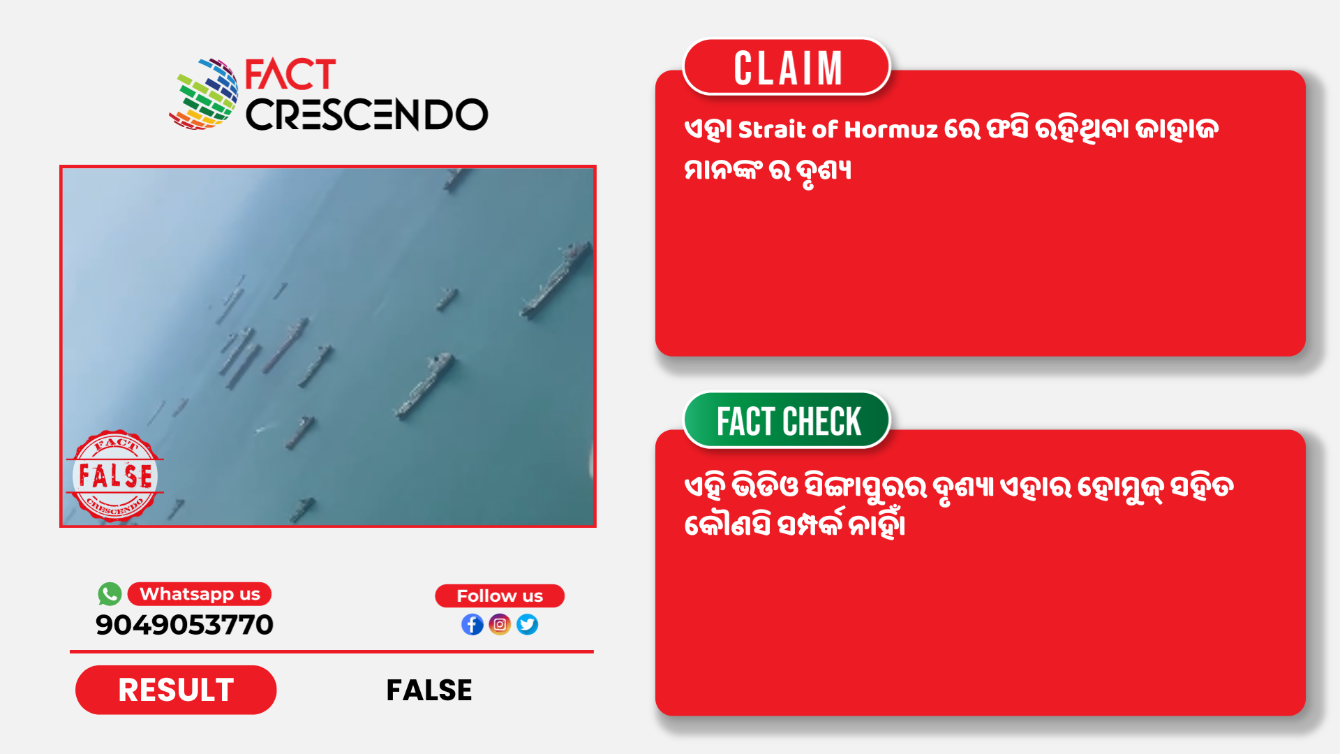 କିନ୍ତୁ ଫ୍ୟାକ୍ଟ କ୍ରିଷେଣ୍ଡୋ ଭାଇରାଲ ଦାବିକୁ ମିଥ୍ୟା ବୋଲି ଜାଣିବାକୁ ପାଇଲା। ଏହା ସିଙ୍ଗାପୁରର ଦୃଶ୍ୟ ଯାହାର ହରମୁଜ୍ ସହିତ କୌଣସି ସମ୍ପର୍କ ନାହିଁ।